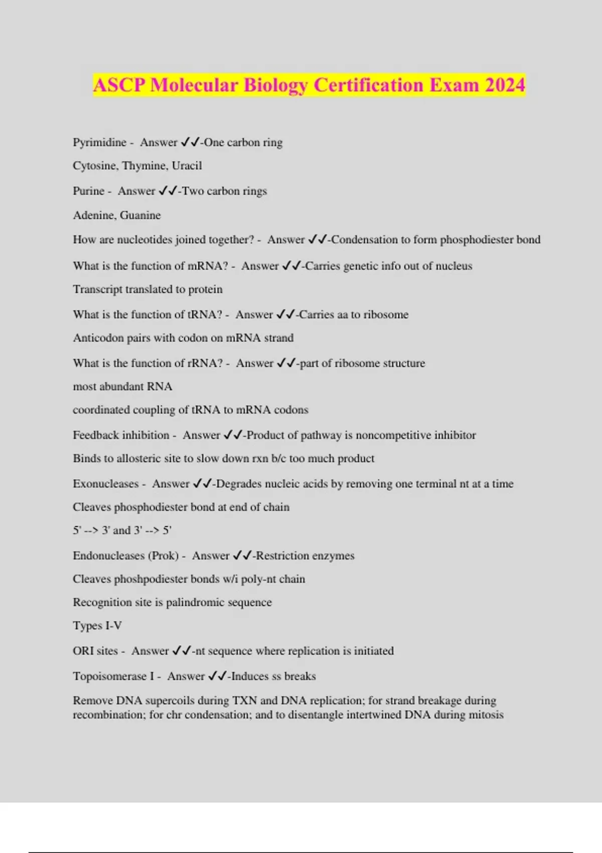 ASCP Molecular Biology Certification Exam 2024 Pyrimidine - Answer ️️ -One carbon ring Cytosine, Thymine, Uracil Purine - Answer ️️ -Two carbon rings Adenine, Guanine How are nucleotides joined together? - Answer ️️ -Condensation to form phosphodiester bond What is the function of mRNA? - Answer ️️ -Carries genetic info out of nucleus Transcript translated to protein What is the function of tRNA? - Answer ️️ -Carries aa to ribosome Anticodon pairs with codon on mRNA strand What is the function of rRNA? - Answer ️️ -part of ribosome structure most abundant RNA coordinated coupling of tRNA to mRNA codons Feedback inhibition - Answer ️️ -Product of pathway is noncompetitive inhibitor Binds to allosteric site to slow down rxn b/c too much product Exonucleases - Answer ️️ -Degrades nucleic acids by removing one terminal nt at a time Cleaves phosphodiester bond at end of chain 5' --> 3' and 3' --> 5' Endonucleases (Prok) - Answer ️️ -Restriction enzymes Cleaves phoshpodiester bonds w/i poly-nt chain Recognition site is palindromic sequence Types I-V ORI sites - Answer ️️ -nt sequence where replication is initiated Topoisomerase I - Answer ️️ -Induces ss breaks Remove DNA supercoils during TXN and DNA replication; for strand breakage during recombination; for chr condensation; and to disentangle intertwined DNA during mitosis topoisomerase II - Answer ️️ -cuts both strands of one DNA double helix, passes another unbroken DNA helix through it, and then reanneals the cut strands Gyrase (topoisomerase II) - Answer ️️ -Unwinds supercoiling caused by unwinding at the rep fork by introducing DSBs Helicase - Answer ️️ -Breaks H-bonds of double helix at the replication fork Primase - Answer ️️ -DNApol α (DNA dep RNA pol) adds short segments of complementary RNA to ssDNA template (primers), serves as starting points for replication single-strand DNA binding proteins (SSBPs) - Answer ️️ -Binds ssDNA and prevents it from re-annealing during TXN, replication, repair, and recombination Okazaki fragments - Answer ️️ -Short fragments of DNA synthesized by DNApol δ using the lagging strand (3'->5') as a template Ligase - Answer ️️ -Closes gaps in DNA Catalyzes phosphodiester bond between 3'OH and 5'P What are the steps in DNA replication? - Answer ️️ -1. Initiate 2. Elongate 3. Terminate Telomeres - Answer ️️ -Repeat sequence (TTAGGG) at the ends of chr, protect chr from degradation RNA polymerase - Answer ️️ -DNA dependent RNApol Transcribes DNA template to RNA (3'-->5'; anti-parallel) Splicesomes - Answer ️️ -Complex of snRNPs Removes introns from pre-mRNA and splices exons together Enhancers - Answer ️️ -Short regions of DNA that bind proteins (TXN factors) that enhance TXN of a gene Poly-A tail - Answer ️️ -Prevents mRNA from being degraded in cytoplasm 100-250 A's at 3' end 5' cap - Answer ️️ -5'-5' pyrophosphate bridge to a methylated G added to 5' end of a mRNA Protects against degradation and as a recognition signal for TLN ap