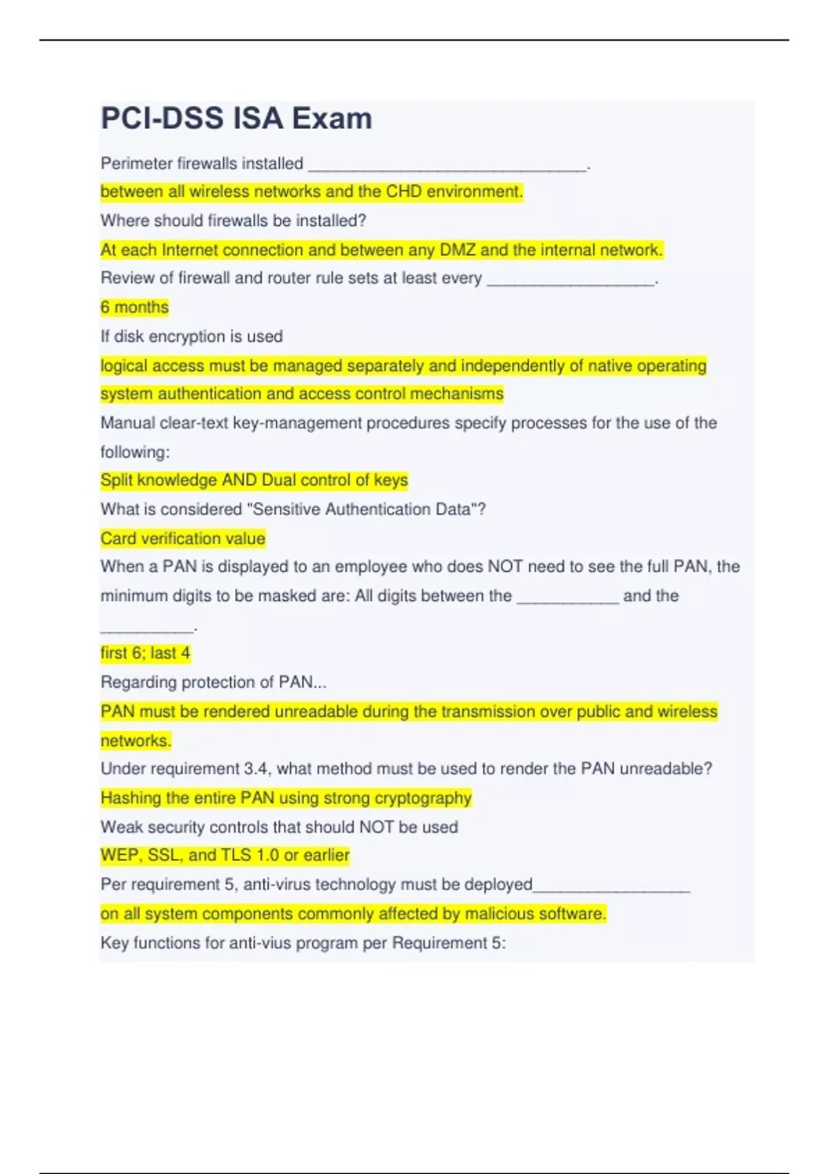 PCI-DSS ISA Exam Perimeter firewalls installed ______________________________. between all wireless networks and the CHD environment. Where should firewalls be installed? At each Internet connection and between any DMZ and the internal network. Review of firewall and router rule sets at least every __________________. 6 months If disk encryption is used logical access must be managed separately and independently of native operating system authentication and access control mechanisms Manual clear-text key-management procedures specify processes for the use of the following: Split knowledge AND Dual control of keys What is considered "Sensitive Authentication Data"? Card verification value When a PAN is displayed to an employee who does NOT need to see the full PAN, the minimum digits to be masked are: All digits between the ___________ and the __________. first 6; last 4 Regarding protection of PAN... PAN must be rendered unreadable during the transmission over public and wireless networks. Under requirement 3.4, what method must be used to render the PAN unreadable? Hashing the entire PAN using strong cryptography Weak security controls that should NOT be used WEP, SSL, and TLS 1.0 or earlier Per requirement 5, anti-virus technology must be deployed_________________ on all system components commonly affected by malicious software.