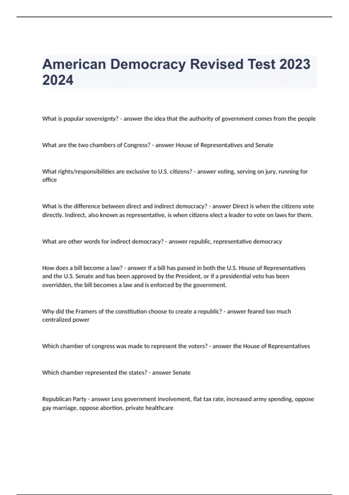 American Democracy Revised Test What is popular sovereignty? - answer the idea that the authority of government comes from the people What are the two chambers of Congress? - answer House of Representatives and Senate What rights/responsibilities are exclusive to U.S. citizens? - answer voting, serving on jury, running for office What is the difference between direct and indirect democracy? - answer Direct is when the citizens vote directly. Indirect, also known as representative, is when citizens elect a leader to vote on laws for them. What are other words for indirect democracy? - answer republic, representative democracy How does a bill become a law? - answer If a bill has passed in both the U.S. House of Representatives and the U.S. Senate and has been approved by the President, or if a presidential veto has been overridden, the bill becomes a law and is enforced by the government. Why did the Framers of the constitution choose to create a republic? - answer feared too much centralized power Which chamber of congress was made to represent the voters? - answer the House of Representatives Which chamber represented the states? - answer Senate Republican Party - answer Less government involvement, flat tax rate, increased army spending, oppose gay marriage, oppose abortion, private healthcare