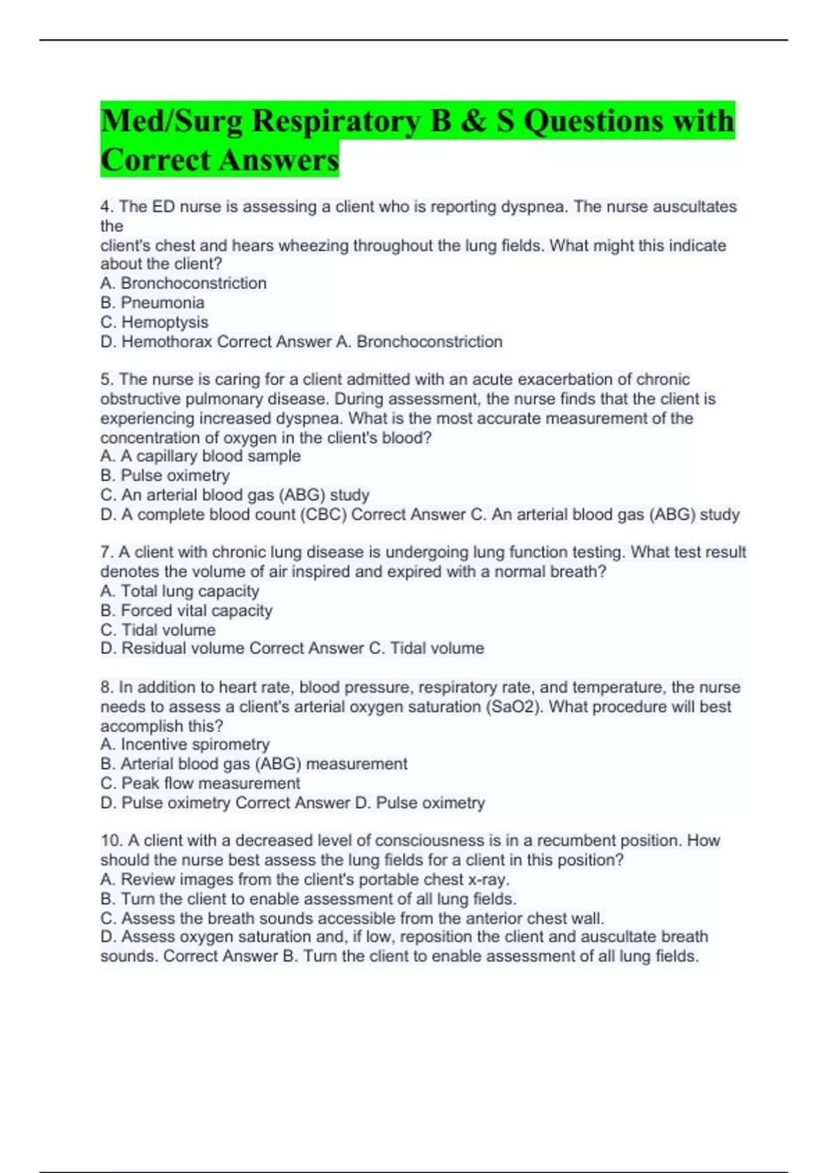 4. The ED nurse is assessing a client who is reporting dyspnea. The nurse auscultates the client's chest and hears wheezing throughout the lung fields. What might this indicate about the client? A. Bronchoconstriction B. Pneumonia C. Hemoptysis D. Hemothorax Correct Answer A. Bronchoconstriction 5. The nurse is caring for a client admitted with an acute exacerbation of chronic obstructive pulmonary disease. During assessment, the nurse finds that the client is experiencing increased dyspnea. What is the most accurate measurement of the concentration of oxygen in the client's blood? A. A capillary blood sample B. Pulse oximetry C. An arterial blood gas (ABG) study D. A complete blood count (CBC) Correct Answer C. An arterial blood gas (ABG) study 7. A client with chronic lung disease is undergoing lung function testing. What test result denotes the volume of air inspired and expired with a normal breath? A. Total lung capacity B. Forced vital capacity C. Tidal volume D. Residual volume Correct Answer C. Tidal volume 8. In addition to heart rate, blood pressure, respiratory rate, and temperature, the nurse needs to assess a client's arterial oxygen saturation (SaO2). What procedure will best accomplish this? A. Incentive spirometry B. Arterial blood gas (ABG) measurement C. Peak flow measurement D. Pulse oximetry Correct Answer D. Pulse oximetry 10. A client with a decreased level of consciousness is in a recumbent position. How should the nurse best assess the lung fields for a client in this position? A. Review images from the client's portable chest x-ray. B. Turn the client to enable assessment of all lung fields. C. Assess the breath sounds accessible from the anterior chest wall. D. Assess oxygen saturation and, if low, reposition the client and auscultate breath sounds. Correct Answer B. Turn the client to enable assessment of all lung fields.