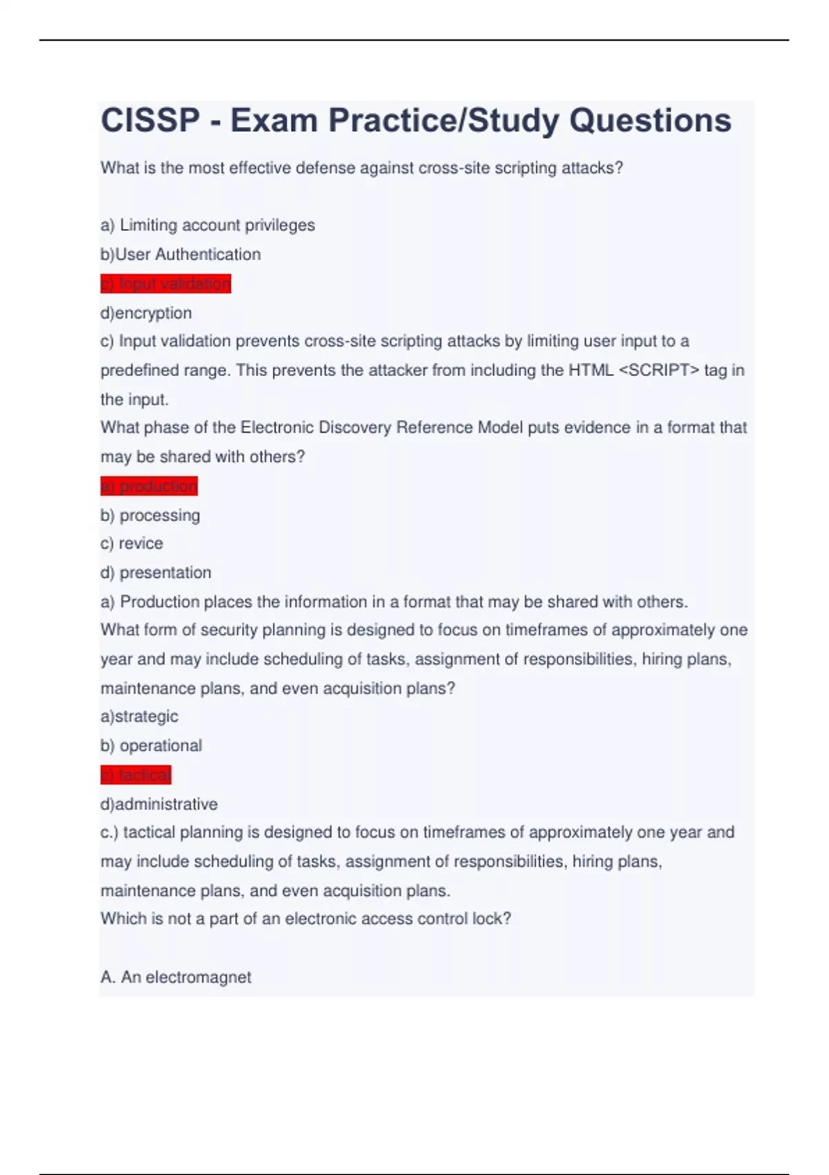 CISSP - Exam Practice/Study Questions What is the most effective defense against cross-site scripting attacks? a) Limiting account privileges b)User Authentication c) Input validation d)encryption c) Input validation prevents cross-site scripting attacks by limiting user input to a predefined range. This prevents the attacker from including the HTML ˂SCRIPT˃ tag in the input. What phase of the Electronic Discovery Reference Model puts evidence in a format that may be shared with others? a) production b) processing c) revice d) presentation a) Production places the information in a format that may be shared with others. What form of security planning is designed to focus on timeframes of approximately one year and may include scheduling of tasks, assignment of responsibilities, hiring plans, maintenance plans, and even acquisition plans? a)strategic b) operational c) tactical d)administrative c.) tactical planning is designed to focus on timeframes of approximately one year and may include scheduling of tasks, assignment of responsibilities, hiring plans, maintenance plans, and even acquisition plans. Which is not a part of an electronic access control lock? A. An electromagnet B. A credential reader C. A door sensor D. A biometric scanner d -An electronic access control (EAC) lock comprises three elements: an electromagnet to keep the door closed, a credential reader to authenticate subjects and to disable the electromagnet, and a door-closed sensor to reenable the electromagnet. Which one of the following items is a characteristic of hot sites but not a characteristic of warm sites? a.Communications circuits B. Workstations C. Servers D. Current data d- current data Which one of the following Data Encryption Standard (DES) operating modes can be used for large messages with the assurance that an error early in the encryption/decryption process won't spoil results throughout the communication? A. Cipher Block Chaining (CBC) B. Electronic Code Book (ECB) C. Cipher Feedback (CFB) D. Output feedback (OFB)