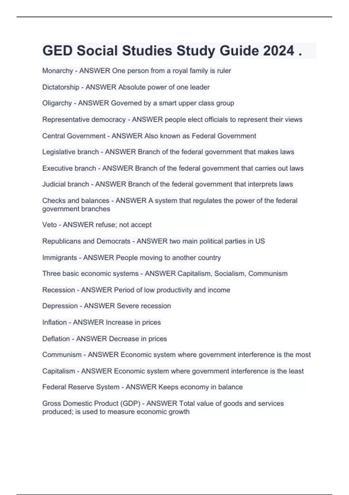 GED Social Studies Study Guide 2024 .Monarchy - ANSWER One person from a royal family is ruler Dictatorship - ANSWER Absolute power of one leader Oligarchy - ANSWER Governed by a smart upper class group Representative democracy - ANSWER people elect officials to represent their views Central Government - ANSWER Also known as Federal Government Legislative branch - ANSWER Branch of the federal government that makes laws Executive branch - ANSWER Branch of the federal government that carries out laws Judicial branch - ANSWER Branch of the federal government that interprets laws Checks and balances - ANSWER A system that regulates the power of the federal government branches Veto - ANSWER refuse; not accept Republicans and Democrats - ANSWER two main political parties in US Immigrants - ANSWER People moving to another country Three basic economic systems - ANSWER Capitalism, Socialism, Communism