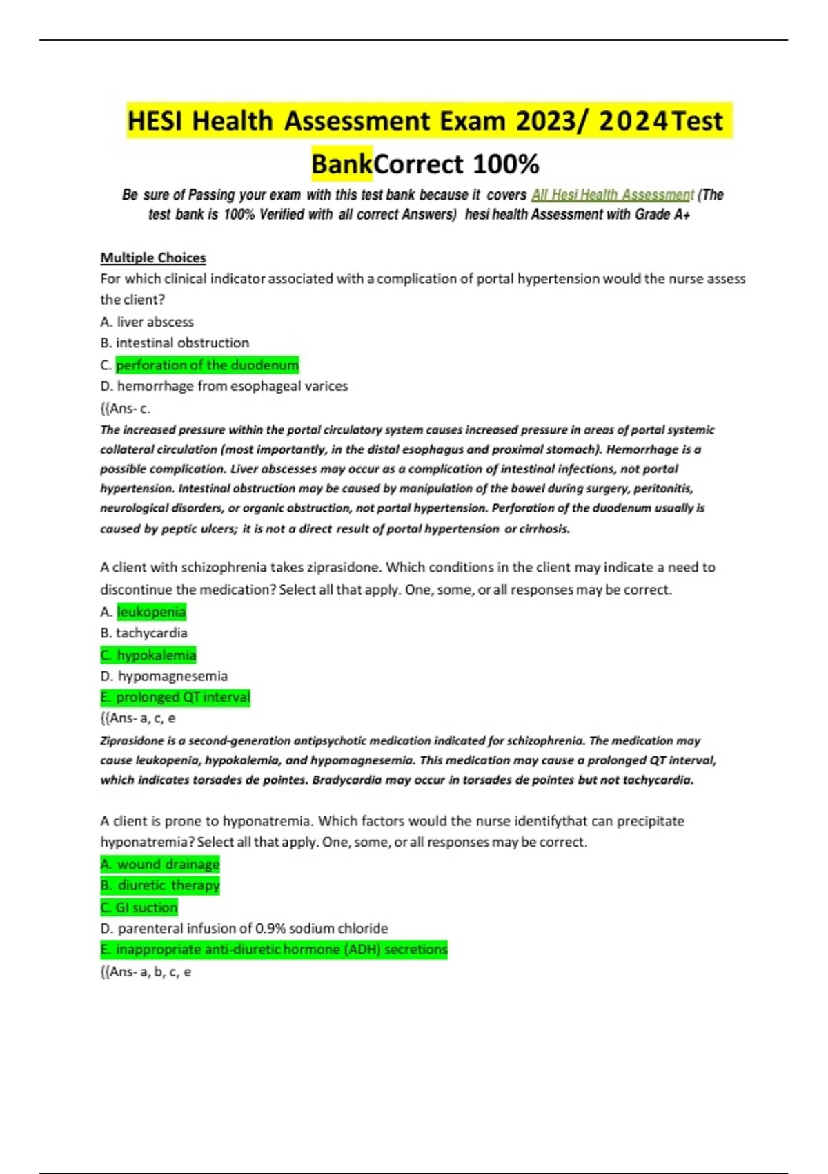 HESI Health Assessment Exam 2023/ 2024Test BankCorrect 100% Be sure of Passing your exam with this test bank because it covers All Hesi Health Assessment (The test bank is 100% Verified with all correct Answers) hesi health Assessment with Grade A+ Multiple Choices For which clinical indicator associated with a complication of portal hypertension would the nurse assess the client? A. liver abscess B. intestinal obstruction C. perforation of the duodenum D. hemorrhage from esophageal varices {{Ans- c. The increased pressure within the portal circulatory system causes increased pressure in areas of portal systemic collateral circulation (most importantly, in the distal esophagus and proximal stomach). Hemorrhage is a possible complication. Liver abscesses may occur as a complication of intestinal infections, not portal hypertension. Intestinal obstruction may be caused by manipulation of the bowel during surgery, peritonitis, neurological disorders, or organic obstruction, not portal hypertension. Perforation of the duodenum usually is caused by peptic ulcers; it is not a direct result of portal hypertension or cirrhosis. A client with schizophrenia takes ziprasidone. Which conditions in the client may indicate a need to discontinue the medication? Select all that apply. One,some, or all responses may be correct. A. leukopenia B. tachycardia C. hypokalemia D. hypomagnesemia E. prolonged QT interval {{Ans- a, c, e Ziprasidone is a second-generation antipsychotic medication indicated for schizophrenia. The medication may cause leukopenia, hypokalemia, and hypomagnesemia. This medication may cause a prolonged QT interval, which indicates torsades de pointes. Bradycardia may occur in torsades de pointes but not tachycardia. A client is prone to hyponatremia. Which factors would the nurse identifythat can precipitate hyponatremia? Select all that apply. One,some, or all responsesmay be correct. A. wound drainage B. diuretic therapy C. GI suction D. parenteral infusion of 0.9% sodium chloride E. inappropriate anti-diuretic hormone (ADH) secretions {{Ans- a, b, c, e Wound drainage can result in hyponatremia from loss of sodium ions. Most diuretics interfere with sodium reabsorption in the nephrons and have the side effect of hyponatremia. Gastrointestinal fluids are rich in sodium ions, which are lost by GI suction. With the syndrome of inappropriate antidiuretic hormone (SIADH), high levels of the antidiuretic hormone (ADH) are produced, causing the body to retain water instead of excreting it normally in the urine. Parenteral infusion of 0.9% sodium chloride, an isotonic solution, should be compatible with body fluids; if given in excess, it may lead to hypernatremia. Which statements made by the client identify regulatory functions of the kidney? Select all that apply. One,some, orallresponsesmay be correct. A. erythropoiesis B. acid base balance C. vitamin D activation D. blood pressure control E. fluid and electrolyte balance {{Ans- b, e Maintaining the acid-base balance of the body by selectively reabsorbing and secreting certain substances from the blood is a regulatory function of the kidneys. The kidneys also perform the regulatory function of electrolyte balance by regulating the reabsorption of certain electrolytes while eliminating others depending on their levels in the serum. The kidneys perform hormonal function by secreting a hormone called erythropoietin that aids in synthesis of red blood cells (erythropoiesis). Activation of vitamin D is a hormonal function of the kidneys. The kidneys perform hormonal function by secreting the hormone renin that assists in blood pressure control. Which signs would the nurse expect to observe in a client with small cell carcinoma of the lung who develops syndrome of inappropriate antidiuretic hormone (SIADH)? Select all that apply. One, some, or allresponsesmay be correct. 1 Oliguria 2 Seizures 3 Vomiting 4 Polydipsia 5 Polyphagia {{Ans- 1, 2, 3 Cancerous cells ofsmall cell lung cancer can produce antidiuretic hormone, which causes fluid retention, resulting in increased blood volume and decreased urine volume. Fluid retention associated with SIADH can cause cerebral edema, resulting in confusion and seizures. Fluid retention resulting in hyponatremia causes nausea and vomiting. The client will have nausea and vomiting, resulting in a decreased oral fluid and food intake. Which urinary diagnostic test does not require any dietary or activity restrictions forthe clie nt before or afterthe test? 1 Renalscan 2 Renal biopsy 3 Renal arteriogram 4 Concentration test {{Ans- 1 A renal scan does not require any dietary or activity restrictions. A renal biopsy requires bed rest for 24 hours after the procedure. A renal arteriogram requires the client to maintain bed rest with affected leg straight. A concentration test requires the client to fast after a given time in the evening. The nurse identifies that a client's urinary output is less than 40 mL/h over the past 3 hours. Which actionwouldthe nurse take? 1 Assess breath sounds and obtain vital signs. 2 Decrease the intravenous flow rate and increase oral fluids. 3 Insert an indwelling catheter to facilitate emptying of the bladder. 4 Check for dependent edema by assessing the lower extremities {{Ans- 1 The imbalance in intake and output, with a decreasing urinary output, may indicate kidney failure. The retention of excess body fluid can precipitate the development of heart failure. Assessing breath sounds and obtaining the vital signs are necessary when monitoring for these complications. In the presence of hypervolemia, oral and intravenous fluid intake should be decreased. There are no data to support a problem with the excretion of urine; the problem is with insufficient production. The insertion of a urinary retention catheter requires a health care provider's prescription. Checking for dependent edema by assessing the lower extremities is an appropriate assessment after respirations and vital sig