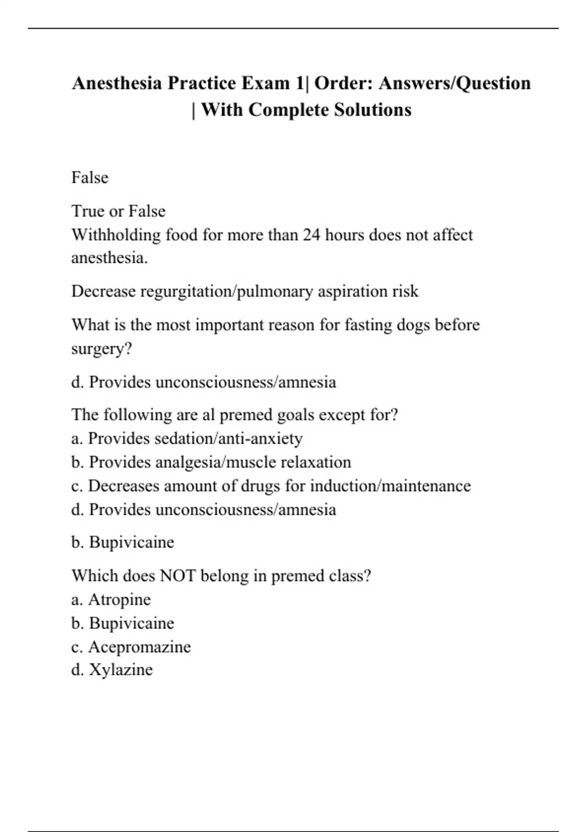 Anesthesia Practice Exam 1| Order: Answers/Question | With Complete Solutions