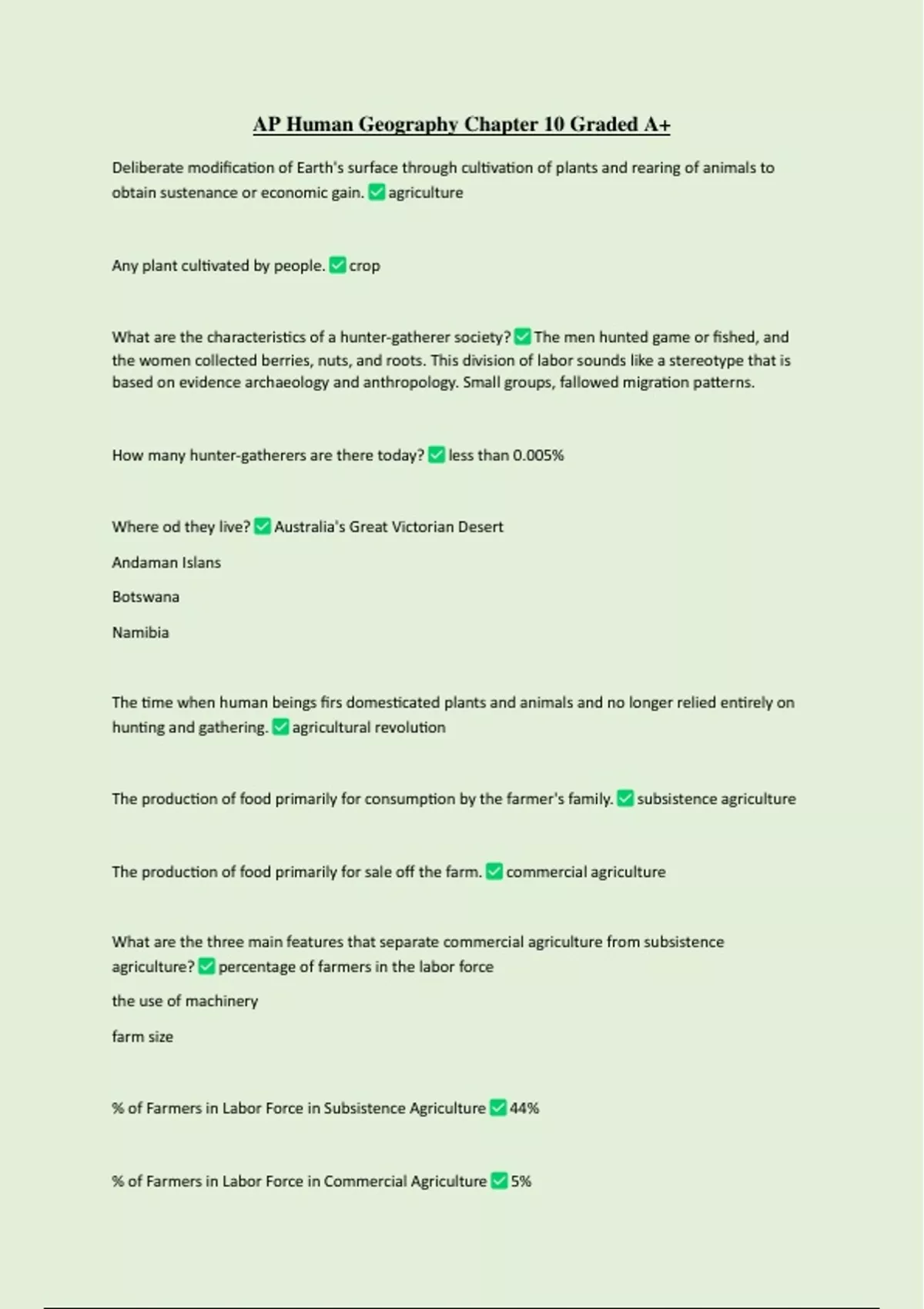 AP Human Geography Chapter 10 Graded A+ Deliberate modification of Earth's surface through cultivation of plants and rearing of animals to obtain sustenance or economic gain. agriculture Any plant cultivated by people. crop What are the characteristics of a hunter-gatherer society? The men hunted game or fished, and the women collected berries, nuts, and roots. This division of labor sounds like a stereotype that is based on evidence archaeology and anthropology. Small groups, fallowed migration patterns. How many hunter-gatherers are there today? Where od they live? less than 0.005% Australia's Great Victorian Desert Andaman Islans Botswana Namibia The time when human beings firs domesticated plants and animals and no longer relied entirely on hunting and gathering. agricultural revolution The production of food primarily for consumption by the farmer's family. The production of food primarily for sale off the farm. subsistence agriculture commercial agriculture What are the three main features that separate commercial agriculture from subsistence agriculture? percentage of farmers in the labor force the use of machinery farm size % of Farmers in Labor Force in Subsistence Agriculture % of Farmers in Labor Force in Commercial Agriculture 44% 5% North America-2% Use of Machinery in Subsistence Agriculture Use of Machinery in Commercial Agriculture Farm Size in Subsistence Agriculture Hand tools and animal power Lots of machines 2.5 acres Farm Size in Commercial Agriculture 418 acres Physical social, and economic access at all times to safe and nutritions food sufficient to meet dietary needs and food preference for an active and healthy life. How much of the world does not have food security? food security one-eighth Dietary energy consumption that is continuously below the minimum requirement for maintaining a healthy life and carrying out light physical activity. undernourishment How much of the world suffers from undernourishment? Where are those places? in developing countries. A form of subsistence agriculture based on the herding of domesticated animal. nomadism In what type of climate is it usually found? In the drylands, so dry climate. What regions of the world are currently occupied by this practice? 870 million and pastoral Central and Southwest Asia and North Africa. How do pastoral nomads obtain grain (several ways)? * many present-day nomads do raise crops * sedentary subsistence farmers in exchange for animal products Camel-North Africa and Southwest Asia along with sheep What animals are chosen, and where? and goats Horse-Central Asia Describe territoriality among pastoral nomads. Every group controls a piece of territory and will invade another groups territory only in an emergency or if war is declared. Seasonal migration of livestock between mountains and lowland pasture areas. In what way do modern governments currently threaten pastoral nomadism? their landed use it for other things. In what climate does shifting cultivation. transhumance They want to take Humid Low-Latitde (A) climate regions.