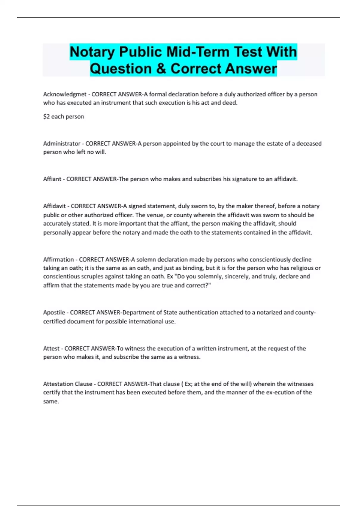 Notary Public Mid-Term Test With Question & Correct Answer Acknowledgmet - CORRECT ANSWER-A formal declaration before a duly authorized officer by a person who has executed an instrument that such execution is his act and deed. $2 each person Administrator - CORRECT ANSWER-A person appointed by the court to manage the estate of a deceased person who left no will. Affiant - CORRECT ANSWER-The person who makes and subscribes his signature to an affidavit