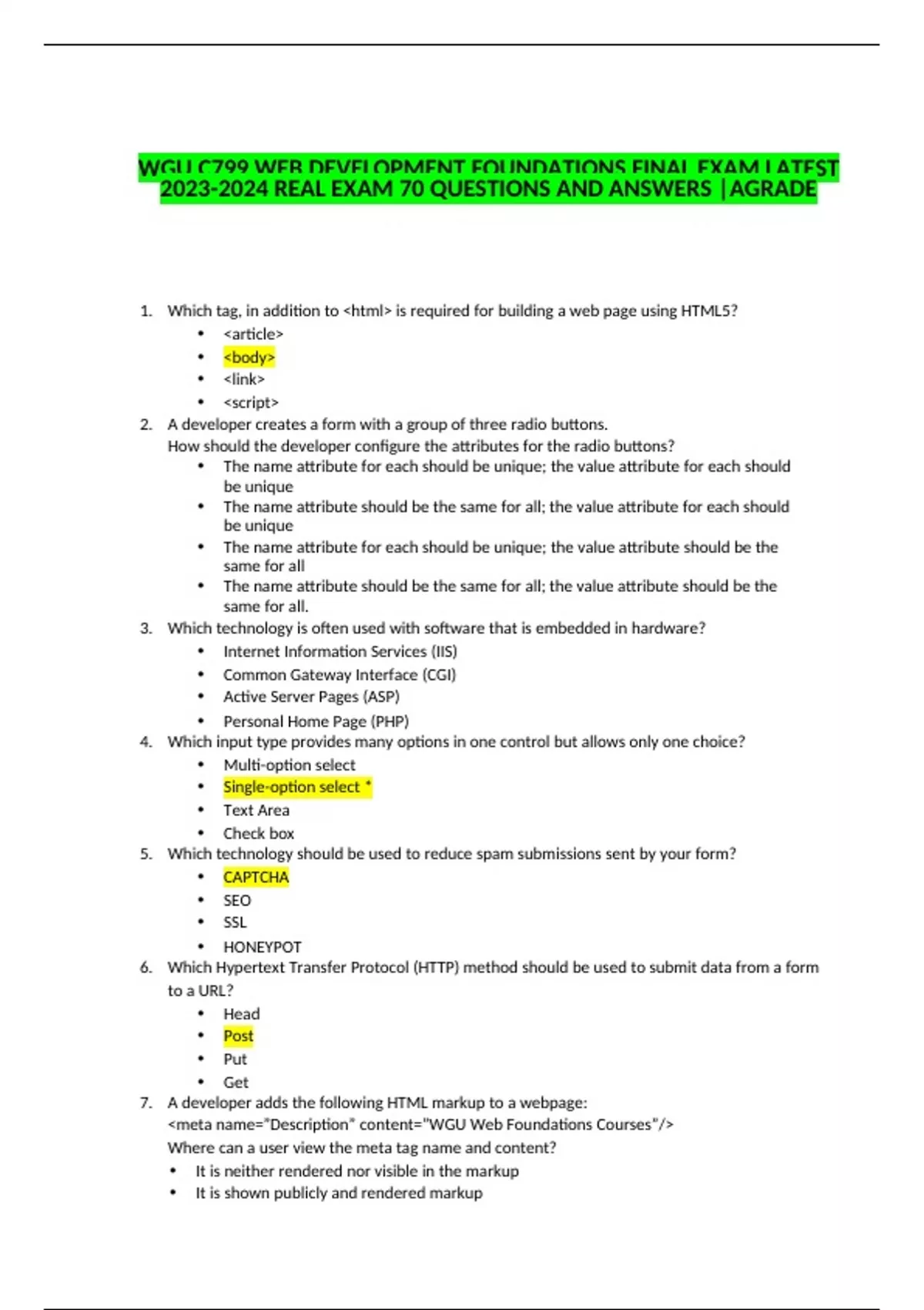 1. Which tag, in addition to html is required for building a web page using HTML5? • article • body • link • script 2. A developer creates a form with a group of three radio buttons. How should the developer configure the attributes for the radio buttons? • The name attribute for each should be unique; the value attribute for each should be unique • The name attribute should be the same for all; the value attribute for each should be unique • The name attribute for each should be unique; the value attribute should be the same for all • The name attribute should be the same for all; the value attribute should be the same for all. 3. Which technology is often used with software that is embedded in hardware? • Internet Information Services (IIS) • Common Gateway Interface (CGI) • Active Server Pages (ASP) • Personal Home Page (PHP) 4. Which input type provides many options in one control but allows only one choice? • Multi-option select • Single-option select * • Text Area • Check box 5. Which technology should be used to reduce spam submissions sent by your form? • CAPTCHA • SEO • SSL • HONEYPOT 6. Which Hypertext Transfer Protocol (HTTP) method should be used to submit data from a form to a URL? • Head • Post • Put • Get 7. A developer adds the following HTML markup to a webpage: meta name=”Description” content=”WGU Web Foundations Courses”/ Where can a user view the meta tag name and content? • It is neither rendered nor visible in the markup • It is shown publicly and rendered markup • It is visible in the markup and rendered • It is visible when inspecting the pages markup 8. Which type of HTML element can have multiple values selected when the multiple=”multiple” attribute is applied? • Select list • Check box • Radio button • Text box 9. Which attribute is used by all form fields? • Value • Src • Href • Name 10. What is true of container tags and empty tags? • Container tags stand alone and empty tags come in pairs • Container tags come in pairs and empty tags stand alone • Container tags and empty tags stand alone • Container tags and empty tags come in pairs 11. Which form field is used to choose a non-exclusive value? • Textbox • Check box • Test area • Radio button 12. Which attribute pair in a form allows data to be uploaded? • Value=”type” • Type=”type” • Value=”file” • Type=”file” 13. What happens to a top-aligned menu as a webpage is scrolled if the menu is formatted using the position fixed CSS code? • Moves with the page • Leaves an empty gap • Appears on the right • Moves to the bottom 14. Which acronym describes color and full transparency? • RGBA • HDMI • PNG • TIFF 15. What does the href attribute indicate about a linked document containing an external style sheet? • Title • Location • Type • Relationship 16. Which line of code results in a background color of green? • Body background-color:green; • Body (background-color:green;) • Body {background-color:green;} • Body [background-color:green;] 17. Which syntax is used for a comment? • */Comment/* • /*Comment*/ • */Comment*/ • /*Comment/* 18. Which two CSS properties are used to set the background color of an HTML element? • Colorbackground • Background-color • Background • Font-colorbackground • Background-font-color 19. Which anchor selector determines the color of unvisited links? • A hover • A link • A visited • An active 20. Which two attributes are required within an image tag? • Float • Src • Align • Alt • Title 21. What is the purpose of the checked=”checked” attribute and value? • To apply a checkered style on radio and checkbox elements • To apply a checkered style on single and multiple-select lists • To pre-select checkbox and multiple select lists • To pre-select radio and checkbox elements 22. Which type of CSS selector should be used to specify the color on an unvisited hyperlink • A visited • Target • A link • Title 23. Which font-size unit specifies the exact size of text rendered on a screen? • Em • Px
