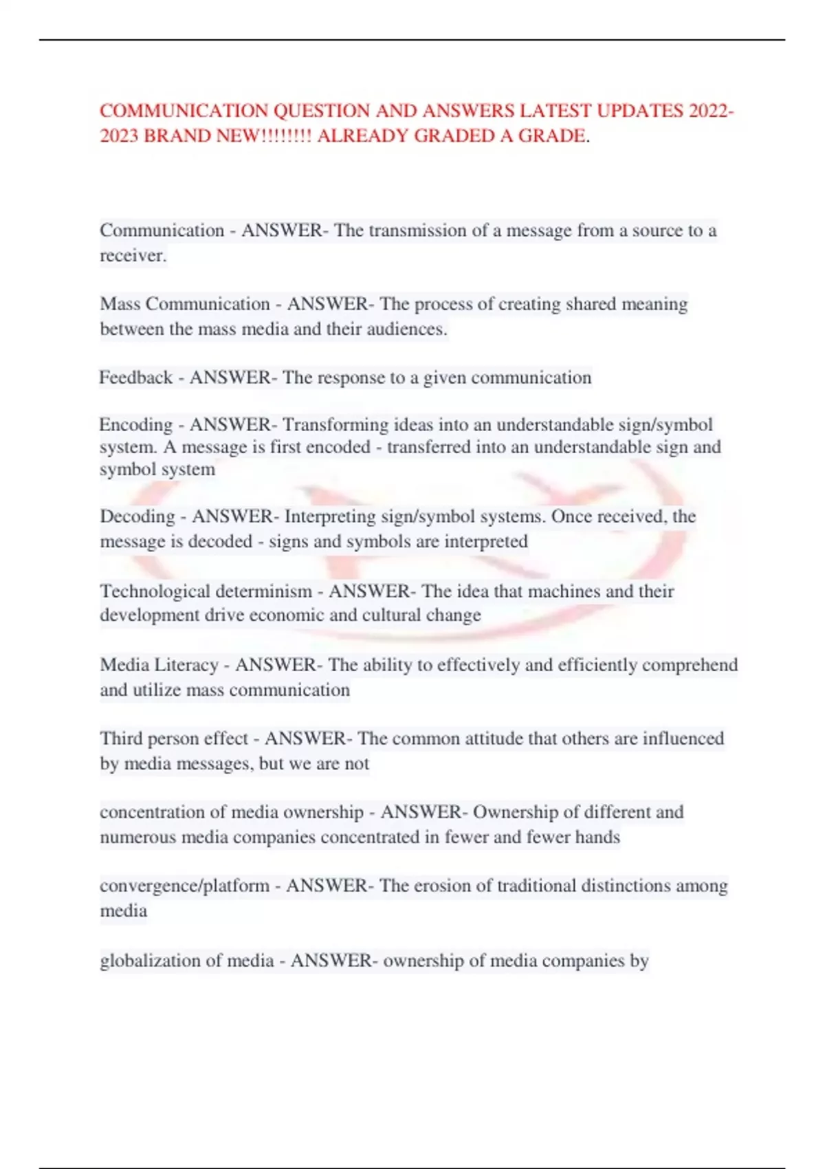 COMMUNICATION QUESTION AND ANSWERS LATEST UPDATES BRAND NEWANSWERS ALREADY GRADED A GRADE.