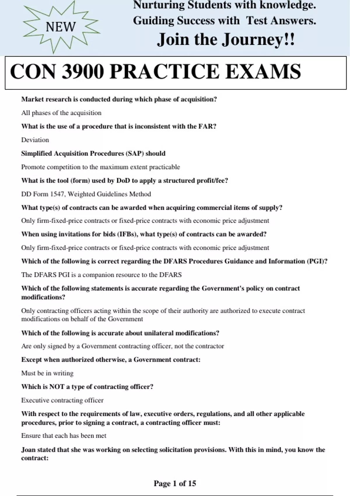 Market research is conducted during which phase of acquisition? All phases of the acquisition What is the use of a procedure that is inconsistent with the FAR? Deviation Simplified Acquisition Procedures (SAP) should Promote competition to the maximum extent practicable What is the tool (form) used by DoD to apply a structured profit/fee? DD Form 1547, Weighted Guidelines Method What type(s) of contracts can be awarded when acquiring commercial items of supply? Only firm-fixed-price contracts or fixed-price contracts with economic price adjustment When using invitations for bids (IFBs), what type(s) of contracts can be awarded? Only firm-fixed-price contracts or fixed-price contracts with economic price adjustment Which of the following is correct regarding the DFARS Procedures Guidance and Information (PGI)? The DFARS PGI is a companion resource to the DFARS Which of the following statements is accurate regarding the Government's policy on contract modifications? Only contracting officers acting within the scope of their authority are authorized to execute contract modifications on behalf of the Government Which of the following is accurate about unilateral modifications? Are only signed by a Government contracting officer, not the contractor Except when authorized otherwise, a Government contract: Must be in writing Which is NOT a type of contracting officer? Executive contracting officer With respect to the requirements of law, executive orders, regulations, and all other applicable procedures, prior to signing a contract, a contracting officer mus
