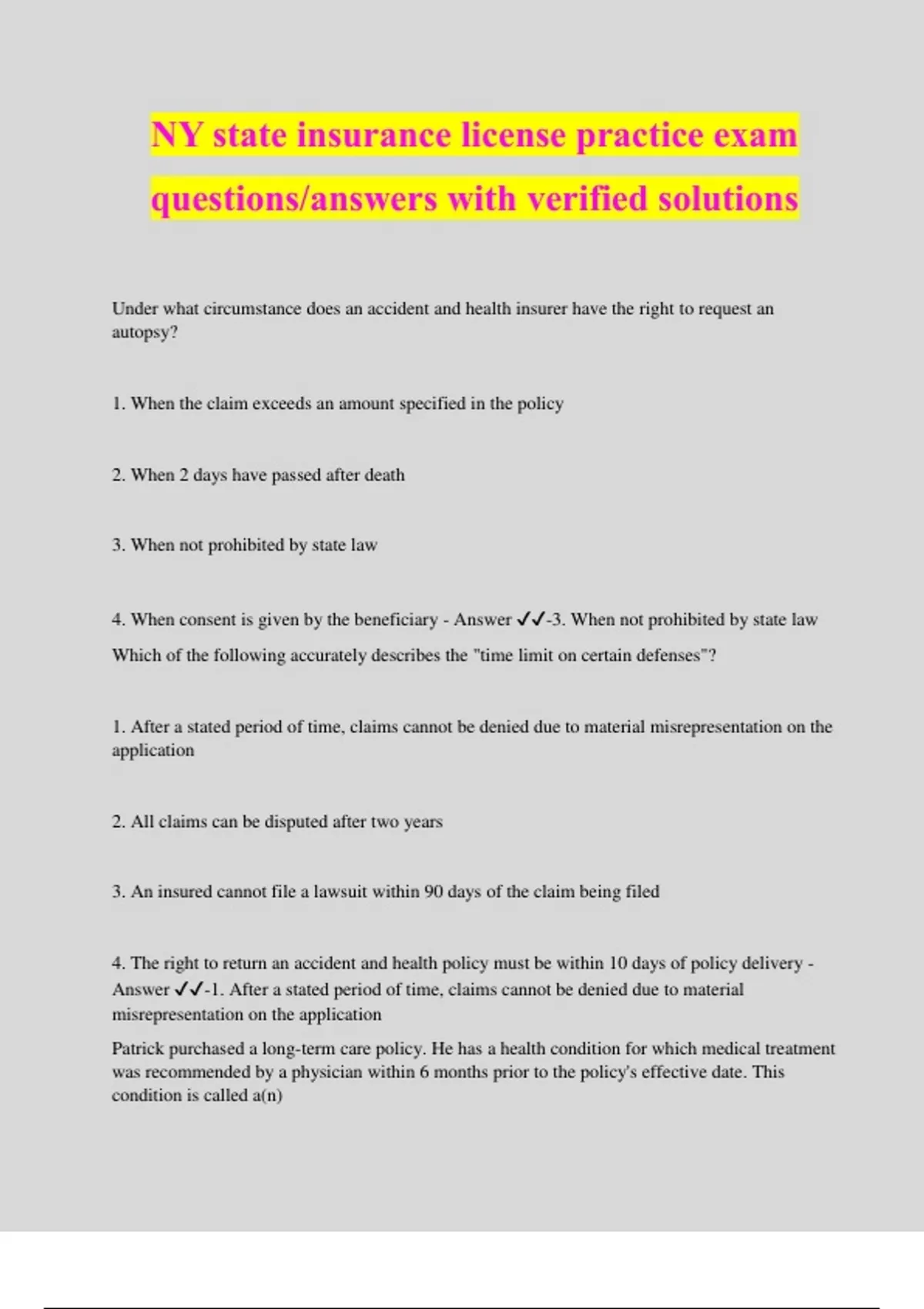 NY state insurance license practice exam questions/answers with verified solutions Under what circumstance does an accident and health insurer have the right to request an autopsy? 1. When the claim exceeds an amount specified in the policy 2. When 2 days have passed after death 3. When not prohibited by state law 4. When consent is given by the beneficiary - Answer ️️ -3. When not prohibited by state law Which of the following accurately describes the "time limit on certain defenses"? 1. After a stated period of time, claims cannot be denied due to material misrepresentation on the application 2. All claims can be disputed after two years 3. An insured cannot file a lawsuit within 90 days of the claim being filed 4. The right to return an accident and health policy must be within 10 days of policy delivery - Answer ️️ -1. After a stated period of time, claims cannot be denied due to material misrepresentation on the application Patrick purchased a long-term care policy. He has a health condition for which medical treatment was recommended by a physician within 6 months prior to the policy's effective date. This condition is called a(n) 1. antecedent condition 2. pre-existing condition 3. hazardous condition 4. grandfathered condition - Answer ️️ -2. pre-existing condition Which of the following describes coverage for the Medicare Part B coinsurance? 1. Only a Long-term care policy will cover Medicare Part B coinsurance 2. A Medicare Supplement optional benefit 3. A Medicare Supplement core benefit 4. Medicare Part B does not require a coinsurance so no additional coverage is needed - Answer ️️ -3. A Medicare Supplement core benefit Larry has a Major Medical Expense policy for his family with a $1,000 per family/per year deductible and an 80/20 coinsurance provision. If Larry's family files four claims of $400, $800, $100, and $700 in one year, how much will the insurance company pay? 1. $500 2. $800 3. $1,000 4. $1,200 - Answer ️️ -2. $800 (($400 + $800 + $100 + $700 = $2,000. The insurance company pays 80% of $1,000 (outstanding balance after deductible is paid), or $800.)) Long-term care policies issued in New York must provide benefits for at least 1. 6 months 2. 12 months 3. 18 months 4. 24 months - Answer ️️ -2. 12 months Which of the following types of insurers limits the exposures it writes to those of its owners? 1. Restricted insurer 2. Limited insurer 3. Confined insurer 4. Captive insurer - Answer ️️ -4. Captive insurer Notice of information practices must be given to a policyholder at least 1. every year 2. every two years 3. every three years 4. every four years - Answer ️️ -3. Every three years What is the elimination period of an individual disability policy? 1. Time period an insured must wait before coverage begins 2. Time period a disabled person must wait before benefits are paid 3. Time period after the policy issue date in which the provisions are still contestable 4. The point in time when benefits are no longer payable - Answer ️️ -2. Time period a disabled person must wait before benefits are paid An individual long-term policy must be renewable 1. To age 65 2. To age 75 3. To age 85 4. For life - Answer ️️ -4. For life When the New York Superintendent of Insurance examines a licensee's insurance records, the primary purpose is to determine 1. The licensee's sales volume 2. The solvency of the licensee's personal accounts 3. The number of insurers represented 4. The licensee's compliance with state insurance law regulations - Answer ️️ -4. The licensee's compliance with state insurance law regulations Medicare supplement insurance that provides a preventative medical care benefit will often cover 1. respite care 2. hospitalization 3. custodial care 4. yearly physical examinations - Answer ️️ -4. yearly physical examinations A family group accident and health insurance policy must continue coverage for each unmarried child at least until age 1. 16 2. 18 3. 19. 4. 21 - Answer ️️ -3. 19 When long-term care insurance is replaced, the insurer issuing the new policy cannot 1. impose a new pre-existing conditions exclusion 2. Charge higher premiums than applied under the replaced policy 3. Require a physical examination 4. Provide a lesser benefit than was available under the replaced policy - Answer ️️ -1. Impose a new pre-existing conditions exclusion Accident and health insurance standard provisions require that 1. The policy, endorsements, and attached papers constitute the entire contract 2. Policies contain a coordination of benefits provision 3. Nonpayment of premium by the due date constitutes irrevocable cancellation by insured 4. The time for payment of claims may be waived by the insured - Answer ️️ -1. The policy, endorsements, and attached papers constitute the entire contract Why does New York law require an insurance agent to examine the existing Medicare Supplement policies of a prospective insured? 1. To uncover instances of unfair trade practices 2. To increase the agent's practical knowledge of insurance 3. To monitor insurance company compliance 4. To determine the suitability of potential changes - Answer ️️ -4. To determine the suitability of potential changes An insured must notify an insurer of a medical claim within how many days after an accident? 1. 10 2. 20 3. 30 4.40 - Answer ️️ -2. 20 days A reciprocal insurer typically has an administrator who manages the premiums collected from the group's members. This administrator is called a(n) 1. reciprocal commission