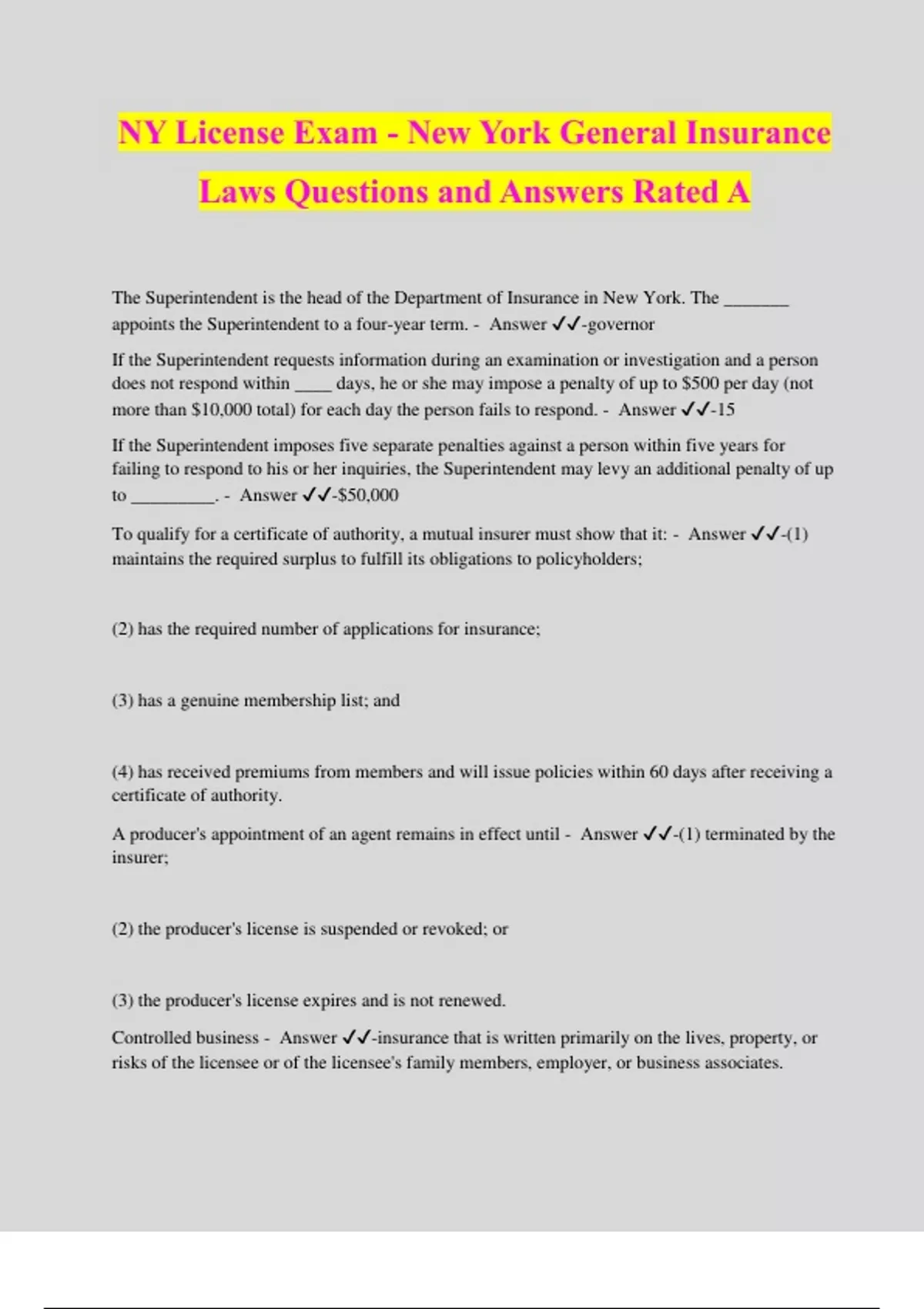 NY License Exam - New York General Insurance Laws Questions and Answers Rated A The Superintendent is the head of the Department of Insurance in New York. The _______ appoints the Superintendent to a four-year term. - Answer ️️ -governor If the Superintendent requests information during an examination or investigation and a person does not respond within ____ days, he or she may impose a penalty of up to $500 per day (not more than $10,000 total) for each day the person fails to respond. - Answer ️️ -15 If the Superintendent imposes five separate penalties against a person within five years for failing to respond to his or her inquiries, the Superintendent may levy an additional penalty of up to _________. - Answer ️️ -$50,000 To qualify for a certificate of authority, a mutual insurer must show that it: - Answer ️️ -(1) maintains the required surplus to fulfill its obligations to policyholders; (2) has the required number of applications for insurance; (3) has a genuine membership list; and (4) has received premiums from members and will issue policies within 60 days after receiving a certificate of authority. A producer's appointment of an agent remains in effect until - Answer ️️ -(1) terminated by the insurer; (2) the producer's license is suspended or revoked; or (3) the producer's license expires and is not renewed. Controlled business - Answer ️️ -insurance that is written primarily on the lives, property, or risks of the licensee or of the licensee's family members, employer, or business associates. Agents and brokers must maintain records showing receipts and disbursements for each premium account. These records must identify: - Answer ️️ -(1) the date and amount of each transaction (2) the name of the insured and insurer (3) the policy binder number (4) the type of risk involved Insurers must keep records of: - Answer ️️ -(1) insurance policies, for six years after the date a policy is no longer is in force or until the next examination report, whichever period is longer (2) applications when a policy is not issued, for six years or until the next examination report, whichever period is longer (3) claim files, for six years after a claim is resolved or until the next examination report, whichever period is longer An insurer's records retention plan must describe: - Answer ️️ -(1) the types of records retained (2) the retention method used (3) the safeguards established to prevent the alteration of records New York has enacted the Insurance Frauds Prevention Act to address the problem of insurance fraud in the state. The act does so by - Answer ️️ -(1) giving the Superintendent broad authority to investigate insurance fraud; (2) encouraging reports of suspected insurance fraud; (3) granting immunity for persons who report suspected insurance fraud; and (4) setting penalties for insurance fraud. The Consumer Information Privacy Regulation - Answer ️️ -governs how insurers and their producers treat personal health information and personal financial information from individuals. When collecting or using nonpublic personal financial or health information, an insurer or producer is required to - Answer ️️ -(1) notify individuals about the insurer's or producer's privacy policies and practices; (2) describe conditions under which an insurer or producer may disclose this information to affiliated companies and nonaffiliated third parties; (3) provide methods for individuals to prevent an insurer or producer from disclosing this information; and (4) provide methods for individuals to prevent an insurer or producer from disclosing this information by not affirmatively consenting to such disclosure. An insurer or producer must notify its current customers of its privacy policies or practices at least - Answer ️️ -once every year. A producer must disclose the following information to purchasers at the time of application: - Answer ️️ -(1) a description of the role the producer plays in the sale of insurance; (2) whether the producer will be compensated by the insurer or another third party for selling insurance; (3) that the producer's compensation may vary depending on the contract and insurer the purchaser selects, the volume of business, and the profitability of the contracts the producer sells; and (4) that the purchaser may ask the producer to provide information about the compensation the producer will receive from the sale as well as the compensation the producer would have received based on alternative quotes presented. If the purchaser requests additional information about the producer's compensation, the producer must disclose the following information at or before policy issuance (or within five days if time is of the essence): - Answer ️️ -(1) a description of the nature, amount, and source of any compensation the producer will receive from th