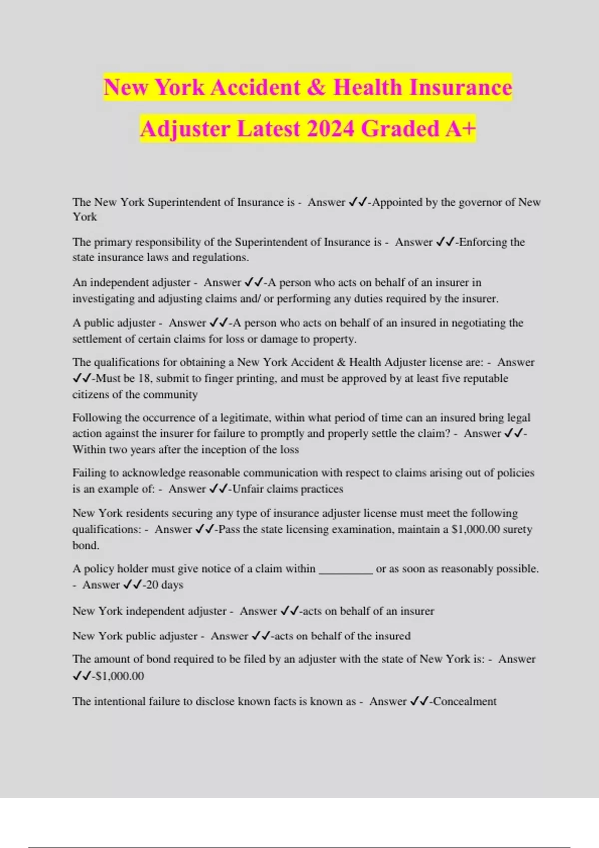New York Accident & Health Insurance Adjuster Latest 2024 Graded A+ The New York Superintendent of Insurance is - Answer ️️ -Appointed by the governor of New York The primary responsibility of the Superintendent of Insurance is - Answer ️️ -Enforcing the state insurance laws and regulations. An independent adjuster - Answer ️️ -A person who acts on behalf of an insurer in investigating and adjusting claims and/ or performing any duties required by the insurer. A public adjuster - Answer ️️ -A person who acts on behalf of an insured in negotiating the settlement of certain claims for loss or damage to property. The qualifications for obtaining a New York Accident & Health Adjuster license are: - Answer ️️ -Must be 18, submit to finger printing, and must be approved by at least five reputable citizens of the community Following the occurrence of a legitimate, within what period of time can an insured bring legal action against the insurer for failure to promptly and properly settle the claim? - Answer ️️ - Within two years after the inception of the loss Failing to acknowledge reasonable communication with respect to claims arising out of policies is an example of: - Answer ️️ -Unfair claims practices New York residents securing any type of insurance adjuster license must meet the following qualifications: - Answer ️️ -Pass the state licensing examination, maintain a $1,000.00 surety bond. A policy holder must give notice of a claim within _________ or as soon as reasonably possible. - Answer ️️ -20 days New York independent adjuster - Answer ️️ -acts on behalf of an insurer New York public adjuster - Answer ️️ -acts on behalf of the insured The amount of bond required to be filed by an adjuster with the state of New York is: - Answer ️️ -$1,000.00 The intentional failure to disclose known facts is known as - Answer ️️ -Concealment An adjuster's license expires: - Answer ️️ -Biennially on December 31 of even numbered years and may be renewed for an ensuing two calendar years. A business or residential address change must be reported to the insurance department within: - Answer ️️ -30 days of the change Federal law addressed fraud, material misrepresentation, embezzlement, and misappropriation of monies involving the interstate commerce of insurance. If found guilty, the punishment will be: - Answer ️️ -Imprisonment for up to 15 years When a person is believed to have violated the New York insurance code, the Superintendent will serve the accused a statement of charges and a notice of a hearing. When must the hearing be held? - Answer ️️ -10 days after the notice is served Statements made by an applicant for an insurance policy which are supposed to be true are referred to as: - Answer ️️ -Representations An act of deliberate deceit with the intent to take property of another or take unfair advantage of another is: - Answer ️️ -Fraud Misrepresentation - Answer ️️ -Leading a client to believe that a policy contains benefits that it does not conta