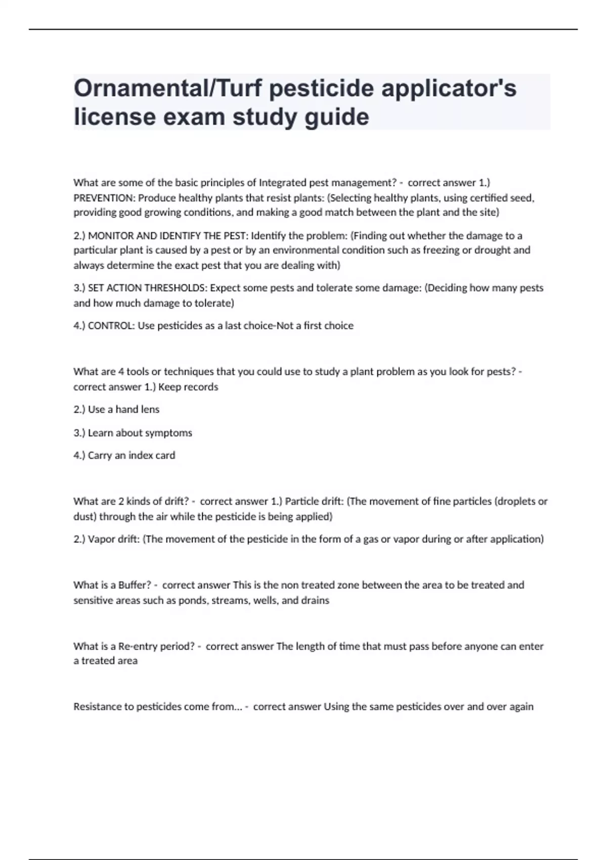Ornamental/Turf pesticide applicator's license exam study guideWhat are some of the basic principles of Integrated pest management? - correct answer 1.) PREVENTION: Produce healthy plants that resist plants: (Selecting healthy plants, using certified seed, providing good growing conditions, and making a good match between the plant and the site) 2.) MONITOR AND IDENTIFY THE PEST: Identify the problem: (Finding out whether the damage to a particular plant is caused by a pest or by an environmental condition such as freezing or drought and always determine the exact pest that you are dealing with) 3.) SET ACTION THRESHOLDS: Expect some pests and tolerate some damage: (Deciding how many pests and how much damage to tolerate) 4.) CONTROL: Use pesticides as a last choice-Not a first choice What are 4 tools or techniques that you could use to study a plant problem as you look for pests? - correct answer 1.) Keep records 2.) Use a hand lens 3.) Learn about symptoms 4.) Carry an index card What are 2 kinds of drift? - correct answer 1.) Particle drift: (The movement of fine particles (droplets or dust) through the air while the pesticide is being applied) 2.) Vapor drift: (The movement of the pesticide in the form of a gas or vapor during or after application) What is a Buffer? - correct answer This is the non treated zone between the area to be treated and sensitive areas such as ponds, streams, wells, and drains What is a Re-entry period? - correct answer The length of time that must pass before anyone can enter a treated area Resistance to pesticides come from... - correct answer Using the same pesticides over and over again
