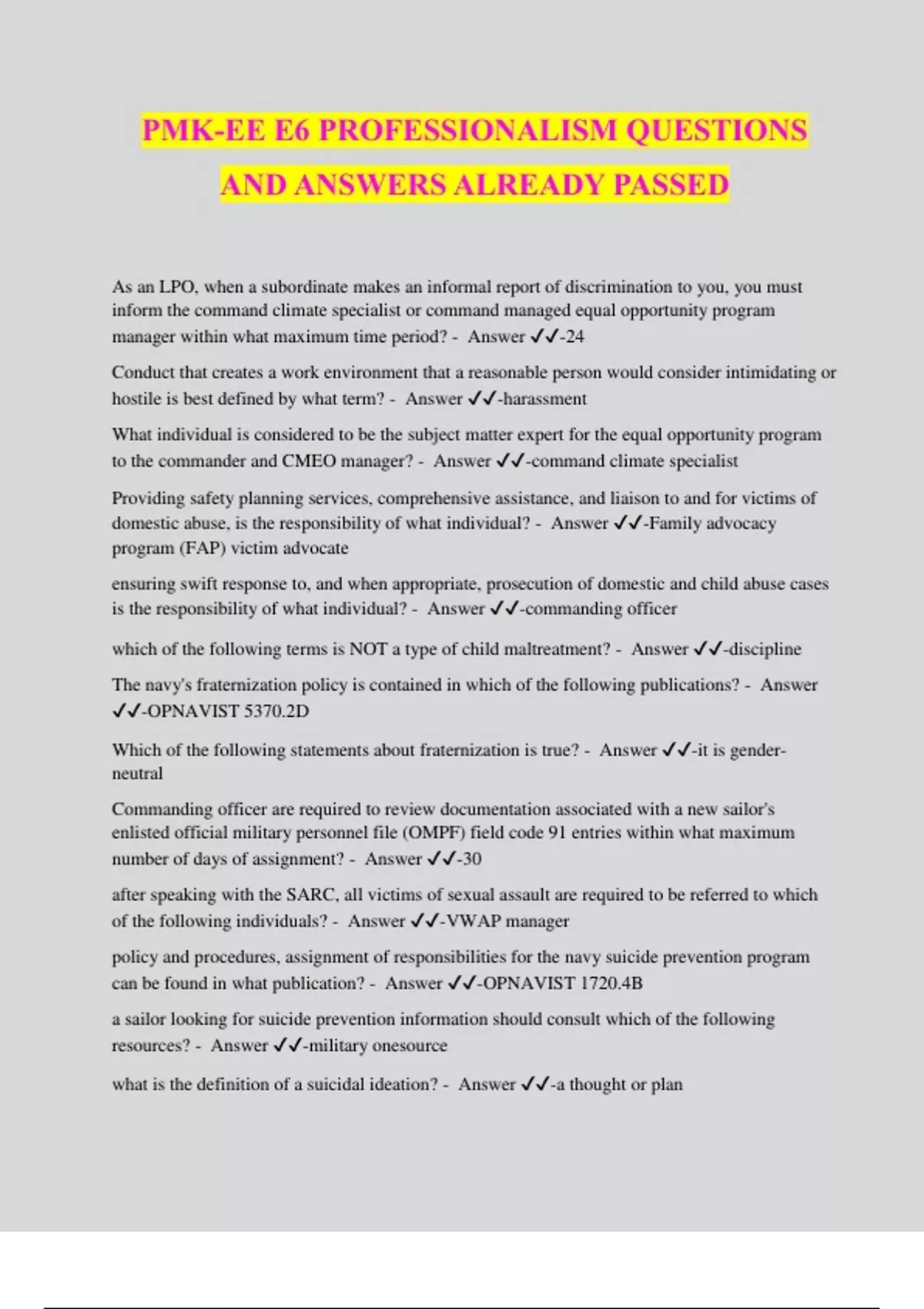 PMK-EE E6 PROFESSIONALISM QUESTIONS AND ANSWERS ALREADY PASSED As an LPO, when a subordinate makes an informal report of discrimination to you, you must inform the command climate specialist or command managed equal opportunity program manager within what maximum time period? - Answer ️️ -24 Conduct that creates a work environment that a reasonable person would consider intimidating or hostile is best defined by what term? - Answer ️️ -harassment What individual is considered to be the subject matter expert for the equal opportunity program to the commander and CMEO manager? - Answer ️️ -command climate specialist Providing safety planning services, comprehensive assistance, and liaison to and for victims of domestic abuse, is the responsibility of what individual? - Answer ️️ -Family advocacy program (FAP) victim advocate ensuring swift response to, and when appropriate, prosecution of domestic and child abuse cases is the responsibility of what individual? - Answer ️️ -commanding officer which of the following terms is NOT a type of child maltreatment? - Answer ️️ -discipline The navy's fraternization policy is contained in which of the following publications? - Answer ️️ -OPNAVIST 5370.2D Which of the following statements about fraternization is true? - Answer ️️ -it is gender- neutral Commanding officer are required to review documentation associated with a new sailor's enlisted official military personnel file (OMPF) field code 91 entries within what maximum number of days of assignment? - Answer ️️ -30 after speaking with the SARC, all victims of sexual assault are required to be referred to which of the following individuals? - Answer ️️ -VWAP manager policy and procedures, assignment of responsibilities for the navy suicide prevention program can be found in what publication? - Answer ️️ -OPNAVIST 1720.4B a sailor looking for suicide prevention information should consult which of the following resources? - Answer ️️ -military onesource what is the definition of a suicidal ideation? - Answer ️️ -a thought or plan which of the following component is NOT part of the personal financial management program? - Answer ️️ -financial assistance when an individual fails the PFA, written notification will be provided to the member using what NAVPERS form? - Answer ️️ -1070/613 personnel in paygrades E1 through E3 who have qualified for a particular rate wear what insignia? - Answer ️️ -striker mark personnel with shaving waivers are allowed to grow facial hair to what maximum length? - Answer ️️ -1/4 in both male and female sea bags should contain what minimum number of undershirts? - Answer ️️ -8 when required to be returned to the issuing activity upon the individual's transfer, clothing loaned to an individual by a navy activity is referred to by what term? - Answer ️️ -organizational clothing to enforce equal opportunity, a command is authorized to take all of the following actions, EXCEPT which one? - Answer ️️ -individual transfers you are approached by a sailor who said he experienced discrimination that has not stopped. he stated that he did NOT want to file a formal complaint, but wanted to discuss the situation. what action should you take? - Answer ️️ -report the in