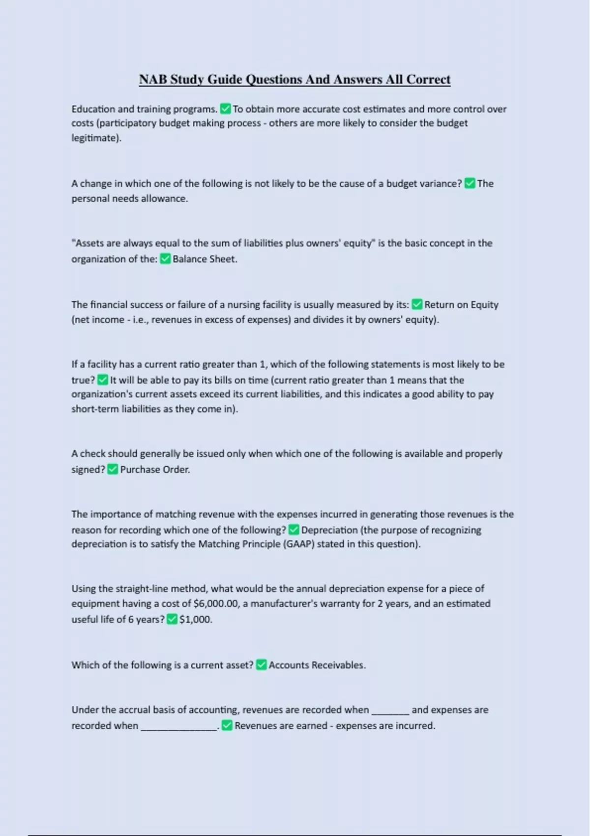 NAB Study Guide Questions And Answers All Correct Education and training programs. To obtain more accurate cost estimates and more control over costs (participatory budget making process - others are more likely to consider the budget legitimate). A change in which one of the following is not likely to be the cause of a budget variance? personal needs allowance. The "Assets are always equal to the sum of liabilities plus owners' equity" is the basic concept in the organization of the: Balance Sheet. The financial success or failure of a nursing facility is usually measured by its: Return on Equity (net income - i.e., revenues in excess of expenses) and divides it by owners' equity). If a facility has a current ratio greater than 1, which of the following statements is most likely to be true? It will be able to pay its bills on time (current ratio greater than 1 means that the organization's current assets exceed its current liabilities, and this indicates a good ability to pay short-term liabilities as they come in). Purchase Order. A check should generally be issued only when which one of the following is available and properly signed? The importance of matching revenue with the expenses incurred in generating those revenues is the reason for recording which one of the following? Depreciation (the purpose of recognizing depreciation is to satisfy the Matching Principle (GAAP) stated in this question). Using the straight-line method, what would be the annual depreciation expense for a piece of equipment having a cost of $6,000.00, a manufacturer's warranty for 2 years, and an estimated useful life of 6 years? $1,000. Which of the following is a current asset? Accounts Receivables. Under the accrual basis of accounting, revenues are recorded when _______ and expenses are recorded when ______________. Revenues are earned - expenses are incurred. A generally accepted accounting principle (GAAP) would be violated if a company: Used in its balance sheet an optimistic estimate of the current market value of its building (the use of current market value rather than historical costs would not be consistent with the Objectivity GAAP, and the use of an optimistic rather than conservative estimate would violate the Conservatism GAAP). Last year's food costs for a 100-bed facility were $146,820. The facility had an average occupancy rate of 85% that year. What was this facility's food cost per patient day (PPD)? $4.73 The Medicare benefit period ends when a beneficiary hospital days nor SNF days Has had 60 straight days with neither any Medicare Part A coverage of skilled nursing facility (SNF) care entails out-of-pocket payment by the patient of a daily amount for which days of SNF care in a benefit period? 21st through 100th Which of the following statements is NOT true regarding the Medicare Prospective Payment System for Skilled Nursing Facilities? There are separate prospective rates for capital-related costs (Medicare does not make separate reimbursement to SNFs for capital-related costs. The RUG rate that the facility receives is expected to cover all types of costs). A RUG is a: Category in a resident classification system. Completion of the Medicare cost report requires carrying out all except which one of the following tasks? Aging of accounts receivable. Abuse. The term for unintentional improper or excessive use of benefits of a health insurance program is: The process by which an individual becomes eligible for Medicaid by incurring medical expenses until personal resources fall below a specified ceiling is called: Spend Down Which of the following statements regarding budgeting procedure is correct? A cash budget may provide advance warning of months when cash outlays fall short of cash receipts. An example of a variable cost is: Nursing supplies. If the facility's occupancy increases from 94% to 98%, the fixed cost per resident Decreases slightly (Fixed cost per resident is calculated by dividing total fixed costs by number of residents (currently occupied beds). If the occupancy rate increases slightly, fixed costs do not change (by definition), and number of residents increase, resulting in a decreased fixed cost per resident. Another way of saying this is that the fixed costs are spread over a larger number of residents.
