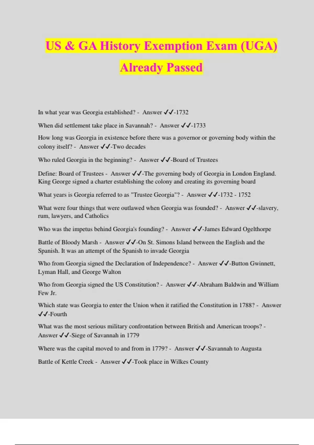 US & GA History Exemption Exam (UGA) Already Passed In what year was Georgia established? - Answer ️️ -1732 When did settlement take place in Savannah? - Answer ️️ -1733 How long was Georgia in existence before there was a governor or governing body within the colony itself? - Answer ️️ -Two decades Who ruled Georgia in the beginning? - Answer ️️ -Board of Trustees Define: Board of Trustees - Answer ️️ -The governing body of Georgia in London England. King George signed a charter establishing the colony and creating its governing board What years is Georgia referred to as "Trustee Georgia"? - Answer ️️ - What were four things that were outlawed when Georgia was founded? - Answer ️️ -slavery, rum, lawyers, and Catholics Who was the impetus behind Georgia's founding? - Answer ️️ -James Edward Ogelthorpe Battle of Bloody Marsh - Answer ️️ -On St. Simons Island between the English and the Spanish. It was an attempt of the Spanish to invade Georgia Who from Georgia signed the Declaration of Independence? - Answer ️️ -Button Gwinnett, Lyman Hall, and George Walton Who from Georgia signed the US Constitution? - Answer ️️ -Abraham Baldwin and William Few Jr. Which state was Georgia to enter the Union when it ratified the Constitution in 1788? - Answer ️️ -Fourth What was the most serious military confrontation between British and American troops? - Answer ️️ -Siege of Savannah in 1779 Where was the capital moved to and from in 1779? - Answer ️️ -Savannah to Augusta Battle of Kettle Creek - Answer ️️ -Took place in Wilkes County Nancy Hart - Answer ️️ -a female patriot and spy credited with killing several Tories at her home When was the ban on slavery in Georgia lifted? - Answer ️️ -1752 Eli Whitney - Answer ️️ -inventor of the cotton gin Yazoo land fraud - Answer ️️ -1795, the sale of western land to four land companies after the governor and members of the General Assembly had been bribed / land companies bribed GA leaders to sell land cheaply; resulted in U.S. take-over of disputed land James Edward Ogelthorpe - Answer ️️ -The leader of English Parliament who founded the Georgia colony, in order to create an effective buffer from the Spanish and Spanish controlled Florida