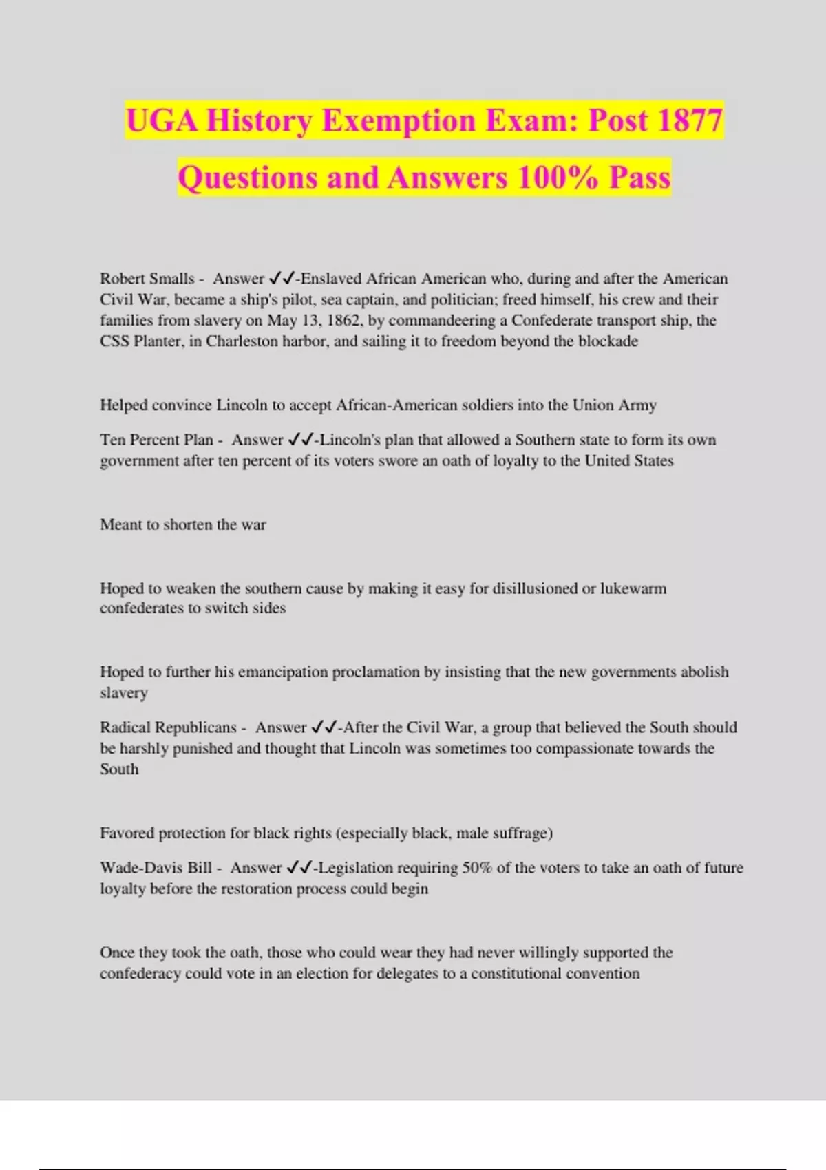 UGA History Exemption Exam: Post 1877 Questions and Answers 100% Pass