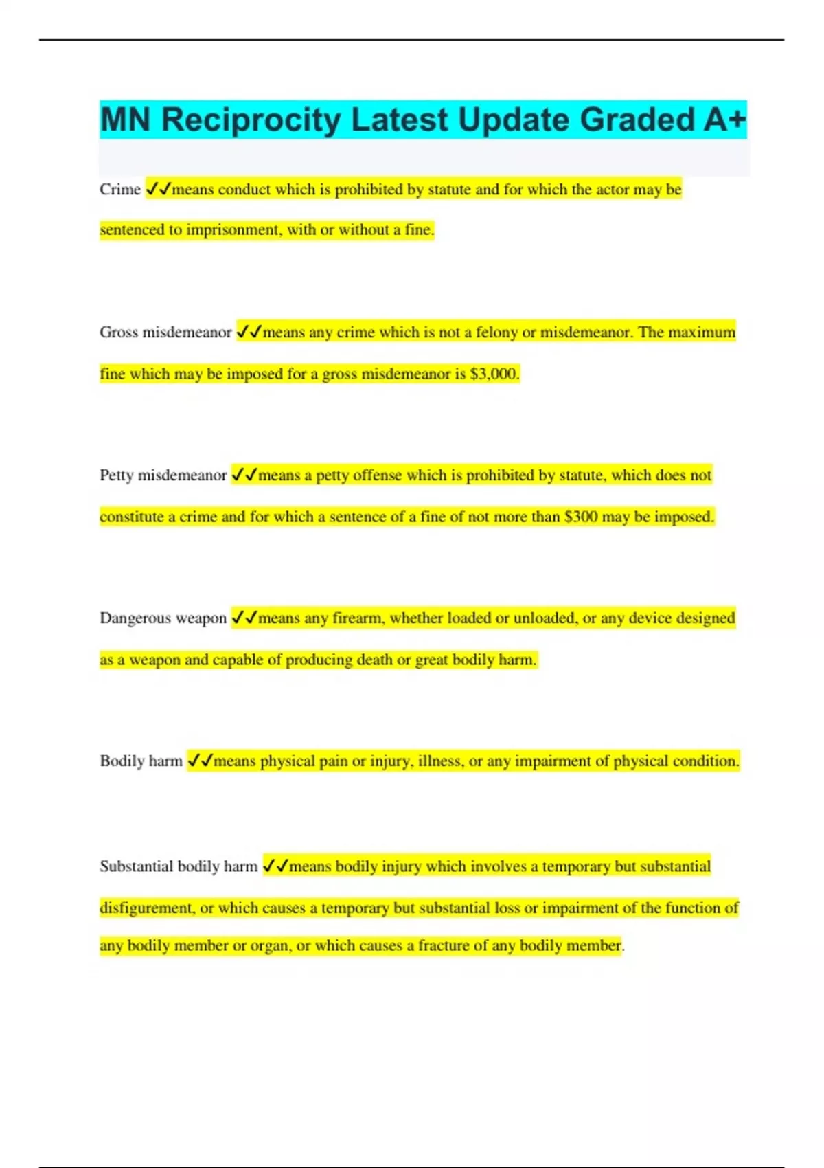 MN Reciprocity Latest Update Graded A+ Crime means conduct which is prohibited by statute and for which the actor may be sentenced to imprisonment, with or without a fine. Gross misdemeanor means any crime which is not a felony or misdemeanor. The maximum fine which may be imposed for a gross misdemeanor is $3,000. Petty misdemeanor means a petty offense which is prohibited by statute, which does not constitute a crime and for which a sentence of a fine of not more than $300 may be imposed. Dangerous weapon means any firearm, whether loaded or unloaded, or any device designed as a weapon and capable of producing death or great bodily harm. Bodily harm means physical pain or injury, illness, or any impairment of physical condition. Substantial bodily harm means bodily injury which involves a temporary but substantial disfigurement, or which causes a temporary but substantial loss or impairment of the function of any bodily member or organ, or which causes a fracture of any bodily member. Great bodily harm means bodily injury which creates a high probability of death, or which causes serious permanent disfigurement, or which causes a permanent or protracted loss or impairment of the function of any bodily member or organ or other serious bodily harm. Assault is: (1) an act done with intent to cause fear in another of immediate bodily harm or death; or (2) the intentional infliction of or attempt to inflict bodily harm upon another. Criminal gang means any ongoing organization, association, or group of three or more persons, whether formal or informal, that: (1) has, as one of its primary activities, the commission of one or more of the offenses listed in section 609.11, subdivision 9; (2) has a common name or common identifying sign or symbol; and (3) includes members who individually or collectively engage in or have engaged in a pattern of criminal activity. Caregiver means an individual or facility who has responsibility for the care of a vulnerable adult as a result of a family relationship, or who has assumed responsibility for all or a portion of the care of a vulnerable adult voluntarily, by contract, or by agreement. Religious establishment a building used for worship services by a religious organization and clearly identified as such by a posted sign or other means. Blackmail means a threat to expose any fact or alleged fact tending to cause shame or to subject any person to hatred, contempt, or ridicule. Sodomy means carnally knowing any person by the anus or by or with the mouth. Business of prostitution means any arrangement between or organization of two or more persons, acting other than as prostitutes or patrons, who commit acts punishable under sections 609.321 to 609.324. Patron means an individual who hires or offers or agrees to hire another individual to engage in sexual penetration or sexual contact. Mutilation means the intentional infliction of physical abuse designed to cause serious permanent disfigurement or permanent or protracted loss or impairment of the functions of any bodily member or organ, where the offender relishes the infliction of the abuse, evidencing debasement or perversion. Child means a person 15 years of age or younger. Sexual conduct means sexual contact of the individual's primary genital area, sexual penetration as defined in section 609.341, or sexual performance as defined in section 617.246. Solicit means commanding, entreating, or attempting to persuade a specific person in person, by telephone, by letter, or by computerized or other electronic means. Escape means departure without lawful authority and failure to return to custody following temporary leave granted for a specific purpose or limited period. Flee means to increase speed, extinguish
