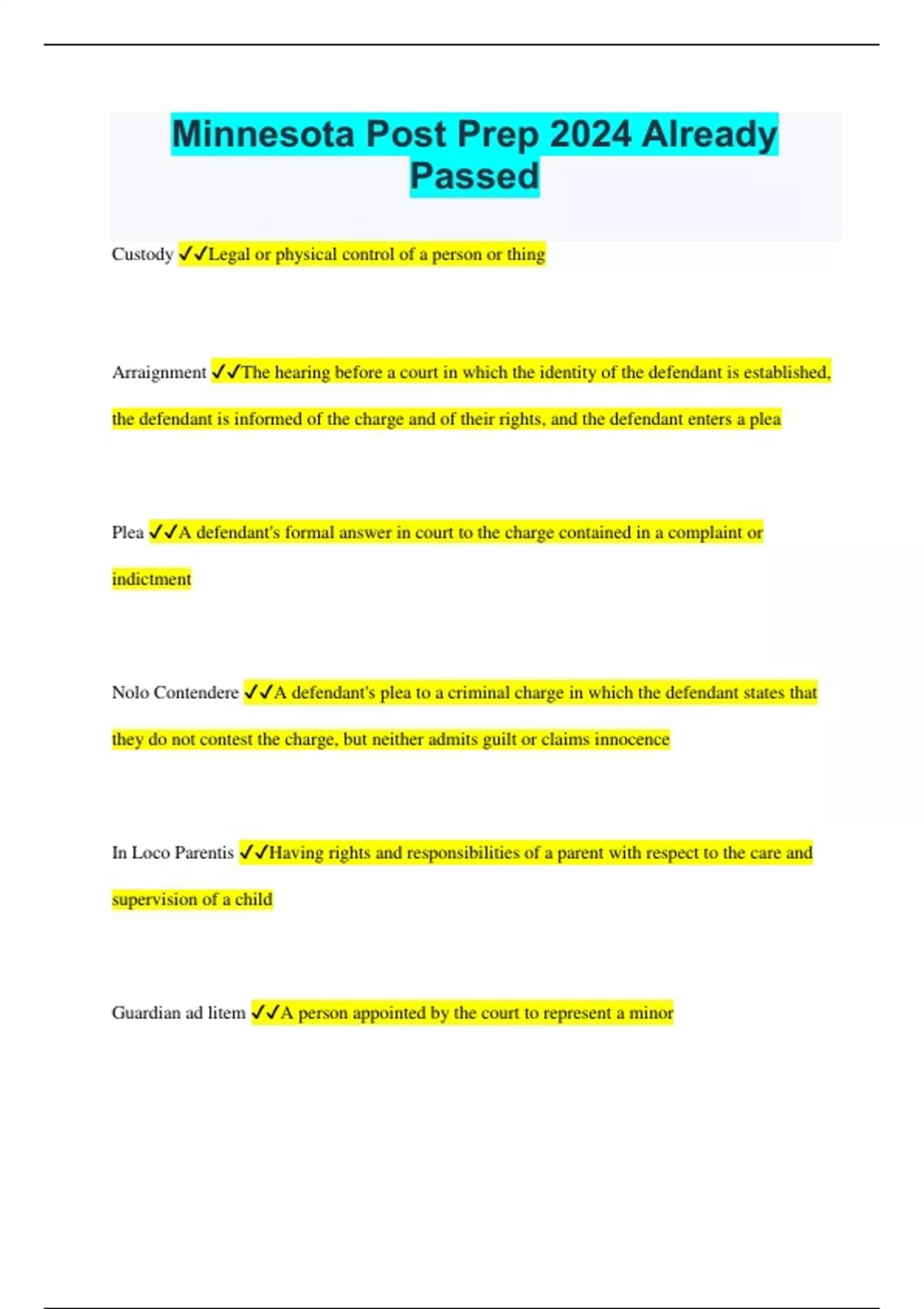 Minnesota Post Prep 2024 Already Passed Custody Legal or physical control of a person or thing Arraignment The hearing before a court in which the identity of the defendant is established, the defendant is informed of the charge and of their rights, and the defendant enters a plea Plea A defendant's formal answer in court to the charge contained in a complaint or indictment Nolo Contendere A defendant's plea to a criminal charge in which the defendant states that they do not contest the charge, but neither admits guilt or claims innocence In Loco Parentis Having rights and responsibilities of a parent with respect to the care and supervision of a child Guardian ad litem A person appointed by the court to represent a minor Intent (Mens Rea) Either to cause a particular result or with knowledge that a particular result will occur Motive The cause that moves or stimulates a person to act Circumstantial evidence Evidence that does not directly prove a fact, but raises a strong inference or suggestion Double Jeopardy Prohibits the prosecution of a defendant for the same offense twice (5th amendment) Entrapment The act of a law enforcement officer in including a person to commit a crime that the person was not otherwise disposed to commit Exigent Circumstances A set of circumstances requiring immediate attention or swift action (Prevent imminent danger to life or damage to property) Conviction A judgement of a court, that the defendant is guilty of the offense Consecutive sentences If an offender has more than one sentence, the first sentence shall be served before the start of the second Concurrent sentences If an offender has more than one sentence, all sentences are served at the same time Megan's Law Requirement of LE agencies to make information available to the public regarding sex offenders and their release into the public Curtilage the ground and buildings immediately surrounding a dwelling and used for domestic purposes Good faith exception an exception to the exclusionary rule. Whenever a LE officer acting with objective good faith has obtained a search warrant from a detached and neutral judge, and acted within its scope, evidence seized pursuant to the warrant will not be excluded Tort a private or civil wrong or injury Crime conduct prohibited by statute for which the actor may be sentenced to imprisonment petty misdemeanor an offense prohibited by statute which does not constitute a crime. Fine up to 300 misdemeanor a crime punishable by imprisonment up to 90 days and/or a fine of 1000 Gross misdemeanor a crime punishable by imprisonment up to one year and/or a fine up to 3000 Felony a crime punishable by imprisonment for more than one year Bodily harm physical injury or pain.