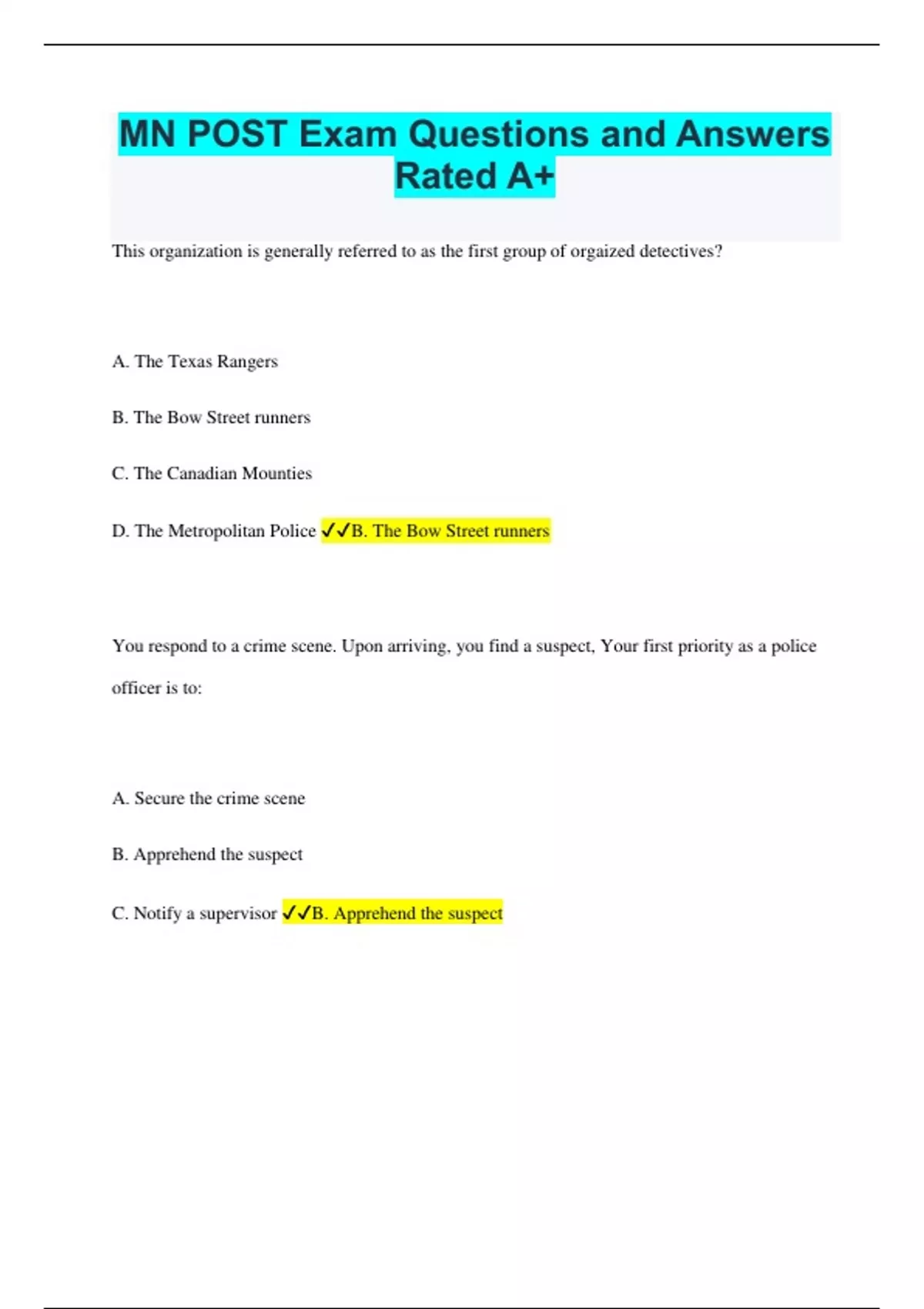 MN POST Exam Questions and Answers Rated A+ This organization is generally referred to as the first group of orgaized detectives? A. The Texas Rangers B. The Bow Street runners C. The Canadian Mounties D. The Metropolitan Police B. The Bow Street runners You respond to a crime scene. Upon arriving, you find a suspect, Your first priority as a police officer is to: A. Secure the crime scene B. Apprehend the suspect C. Notify a supervisor B. Apprehend the suspect You are dispatched to a local sporting goods business to arrest a shoplifter. Upon responding you determine that the shoplifter's jacket has been altered to have pockets to conceal merchandise. Whih of the following would be the appropriate procedure to follow? A. To have the shop owner or employee perform a citizens arrest B. Arrest the person via your authority as a police officer C. Issue a warning B. Arrest the person via your authority as a police officer The United States Supreme Court hears cases dealing with which of the fllowing issues: A. Cases which touch upon the interpretation of the constitution B. First Degree Murder Convictions C. Appeals interpreting a violation of state statutes A. Cases which touch upon the interpretation of the constitution While on rutine patrol, you are dispatched to a complainant of a violation of a motorist violating a school bus stop arm. In order to make a misdemeanor arrest, you must do which of the following? A. Observe the offense personally B. Have the bus driver make a citizens arrest C. Issue a citation once you are satisfied that probable cause has been established C. Issue a citation once you are satisfied that probable cause has been established As a police officer, you have discharged your weapon while on duty. This discharge would be classified as which of the following? A. The use of deadly force B. It would depend upon the injury received by the fire that was shot C. A warning shot A. The use of deadly force What is considered to be the primary legal authority? A. City Ordinance