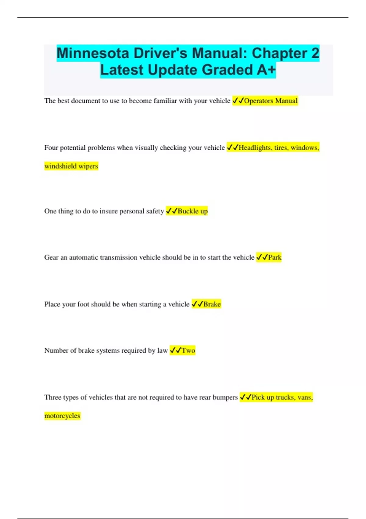 Minnesota Driver's Manual: Chapter 2 Latest Update Graded A+ The best document to use to become familiar with your vehicle Operators Manual Four potential problems when visually checking your vehicle Headlights, tires, windows, windshield wipers One thing to do to insure personal safety Buckle up Gear an automatic transmission vehicle should be in to start the vehicle Park Place your foot should be when starting a vehicle Brake Number of brake systems required by law Two Three types of vehicles that are not required to have rear bumpers Pick up trucks, vans, motorcycles True or False: Bells/whistles can be used if your horn is not operational False Number of times a year headlights require adjustment One Percentage dirty headlights output can be reduced Seventy five percent Requirement of license plate during nighttime hours White light bulb Vehicle that is required to only have one tail light Motorcycle Thing a vehicle must be equipped with on the exhaust A muffler to keep it from making sudden or prolonged loud noises Major problem a leaky muffler can present Carbon monoxide leaks Required if rear view mirror is blocked Additional or larger side mirror Minimum tread depth one sixteenth a inch PSI stands for Pounds per square inch Position in which GPS systems must be mounted Bottommost position of the windshield Inertia Property of matter that causes it to resist any change in motion Isaac Newton's 1st law A body at rest stays at rest while a body in motion stays in motion unless acted upon by a external force. A body in