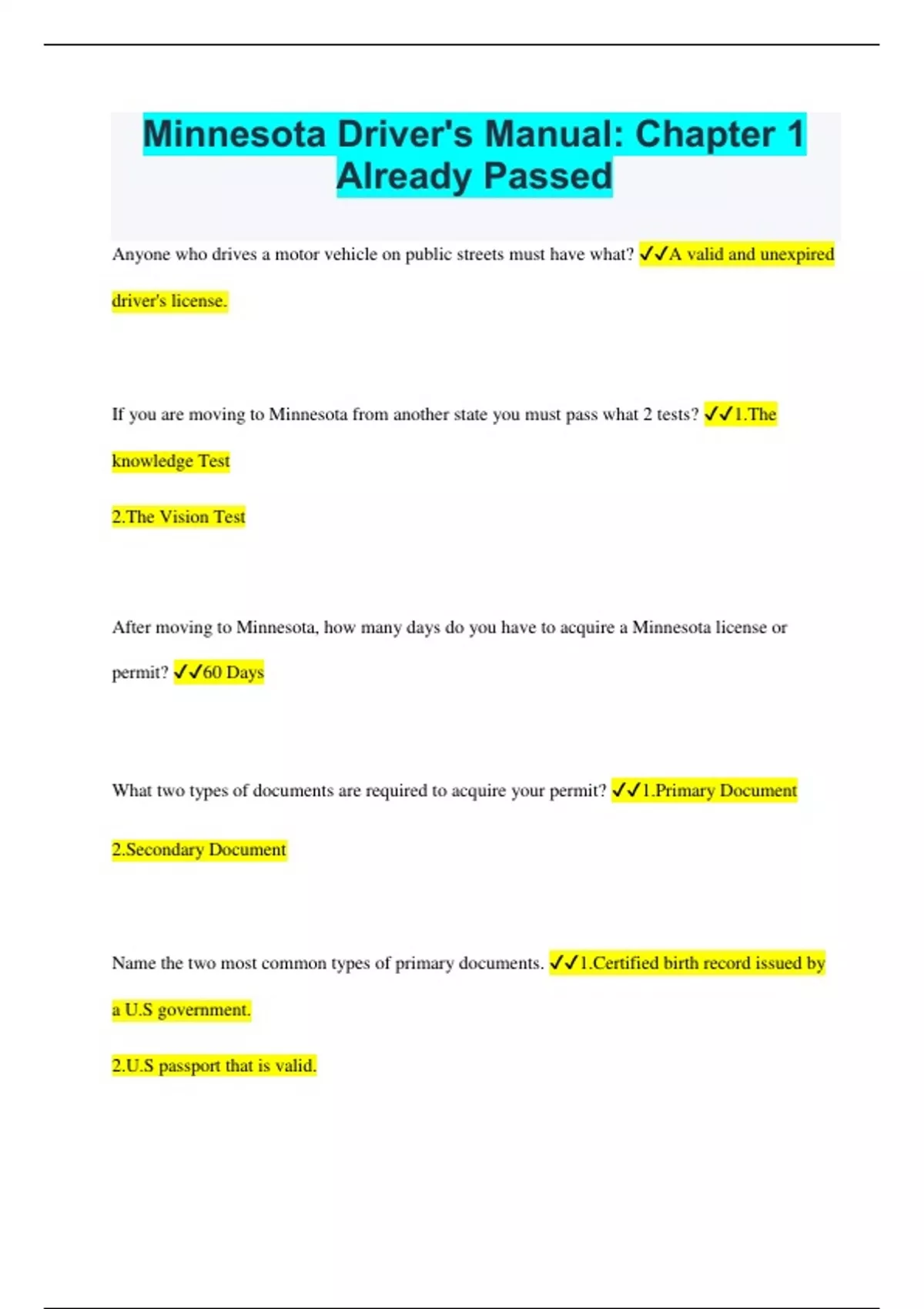 Minnesota Driver's Manual: Chapter 1 Already Passed Anyone who drives a motor vehicle on public streets must have what? A valid and unexpired driver's license. If you are moving to Minnesota from another state you must pass what 2 tests? 1.The knowledge Test 2.The Vision Test After moving to Minnesota, how many days do you have to acquire a Minnesota license or permit? 60 Days What two types of documents are required to acquire your permit? 1.Primary Document 2.Secondary Document Name the two most common types of primary documents. 1.Certified birth record issued by a U.S government. 2.U.S passport that is valid. Name the two most common types of secondary documents. 1.U.S Social Security Card 2.Current student I.D. Card What secondary document number must be on a Minnesota Driver application? Social Security number (SSN) What does the knowledge test examine in you? Your knowledge and understanding of Minnesota traffic laws and road signs. What percentage must you achieve to pass the knowledge test? 80% or more. What card is required to take a knowledge test outside of the classroom and if you are under 18 years of age? Blue Card What is the fee to take the knowledge test if you fail two or more times? $10 What vision must you have to apply for a permit or license? At least 20/40. What degree of peripheral vision is required to apply for a permit or license? 105 Degrees What does the road test examine? Your knowledge of rules of the road and the ability to drive a motor vehicle safely under normal traffic conditions. What is required to take the road test if you are under 18 years of age? 1.Valid Instruction Permit. 2. Current proof of insurance. 3. White card: Proves you have taken the education course and your required time amount of Behind the Wheel. What is required of you if you fail the road test, and want to take it again? To complete the designated amount of practice time set by the instructor? Who must sign your application for your license and permit if you are under 18 years of age? A parent/legal guardian. What does the GDL System state? Anyone under 18 years of age must hold an instruction permit for at least 6 months. How long is a permit valid for? 2 years. What do you need to do to obtain an instruction permit? (7 things) * 15 years of age or older. *30 hours of classroom time. *Enrollment in Behind -the-wheel. *Comply with identification requirements. *Pass a vision and knowledge test. *Complete a license application *Pay the required fee.