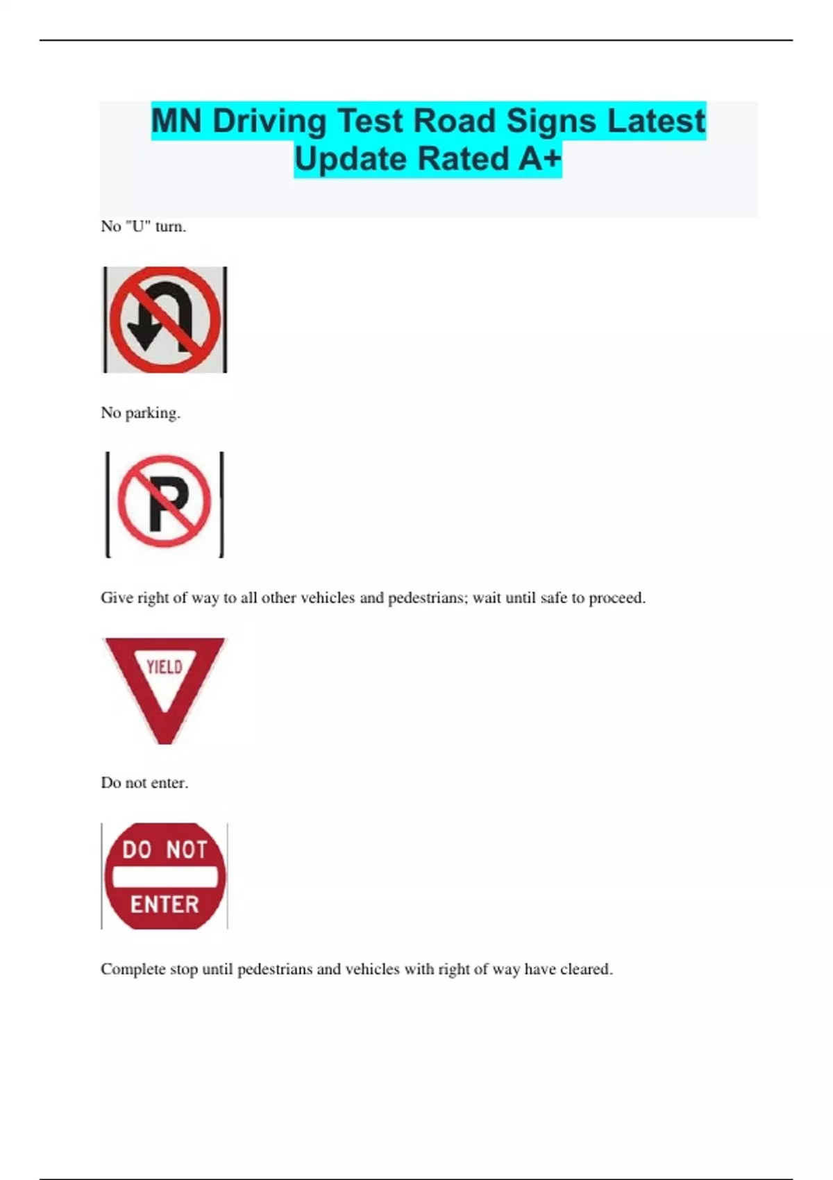 MN Driving Test Road Signs Latest Update Rated A+ No "U" turn. No parking. Give right of way to all other vehicles and pedestrians; wait until safe to proceed. Do not enter. Complete stop until pedestrians and vehicles with right of way have cleared. Railroad crossing ahead. Wrong way. Slow moving vehicle; displayed on all vehicles that travel less than 30 mph. Railroad crossing crossbuck. Center lane only; shared lane for making left turns. Tells you which lanes you can/cannot turn from. Keep right; stay to the right of traffic island. School zone; school or school crossing. Steep hill. Slippery road.