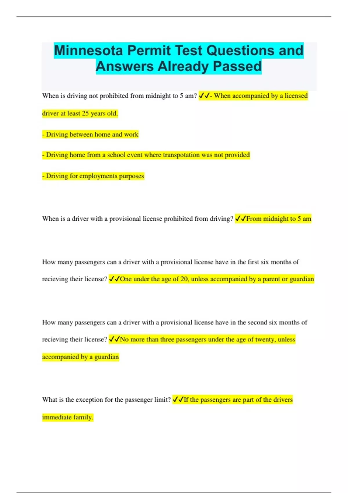 Minnesota Permit Test Questions and Answers Already Passed When is driving not prohibited from midnight to 5 am? - When accompanied by a licensed driver at least 25 years old. - Driving between home and work - Driving home from a school event where transpotation was not provided - Driving for employments purposes When is a driver with a provisional license prohibited from driving? From midnight to 5 am How many passengers can a driver with a provisional license have in the first six months of recieving their license? One under the age of 20, unless accompanied by a parent or guardian How many passengers can a driver with a provisional license have in the second six months of recieving their license? No more than three passengers under the age of twenty, unless accompanied by a guardian What is the exception for the passenger limit? If the passengers are part of the drivers immediate family. What is Vanessa's Law? An unlicensed teen driver with a crash-related moving violation or an alcohol/controlle substance-violation cannot be given a license, instruction permit, or provisional license until age 18. After Vanessa's Law what must the driver do at age 18? - Pass the knowledge test - Fulfill reinstatement requirements, including payment fees of which can be up to $680 - Obtain learners permit for six months - Pass the road test What can a driver with a Class D license operate? -Many single unit vehicle (car,pickup, truck) under 26,00lbs - Any farm tucks trucks transporting goods within 150 miles of the farm - Authorized emergency vehicles - Recreational vehicles - Motorized bikes or Motorcycles - Neighborhoos electric vehicles What single unit vehiclas can someone with a Class D license not drive? - Vehicle over 26,000lbs - Vehicles meant for 15 passengers or more(including driver) - Vehicles that carry hazardous materials What are the commercial drivers licenses? Class A, B and C licenses are called commercial driver's licenses What is bad about dirty headlights? Dirty headlights can reduce light output by as much as 75 percent. When are you required to use headlights? Your headlights must be turned on at sunset and used until sunrise.They must also be used during weather conditions that include rain,snow, hail, sleet, or fog and any time you cannot clearly see the road ahead for a distance of at least 500 feet. What does the muffler do? Mufflers keep the vehicle from making sudden or prolonged loud noises, particularly sharp popping or crackling sounds. When is a tire illegal to drive with? A tire is illegal if the tread is less than one-sixteenth of an inch deep. What is the exception to going above the speed limit on the highway? The speed limit on two-lane highways with a posted speed limit of 55 mph or higher is increased by 10 mph when the driver is lawfully passing another vehicle in the same direction. How can you lose right of way when entering an intersection? If you approach an intersection at an unlawful speed, you losethe