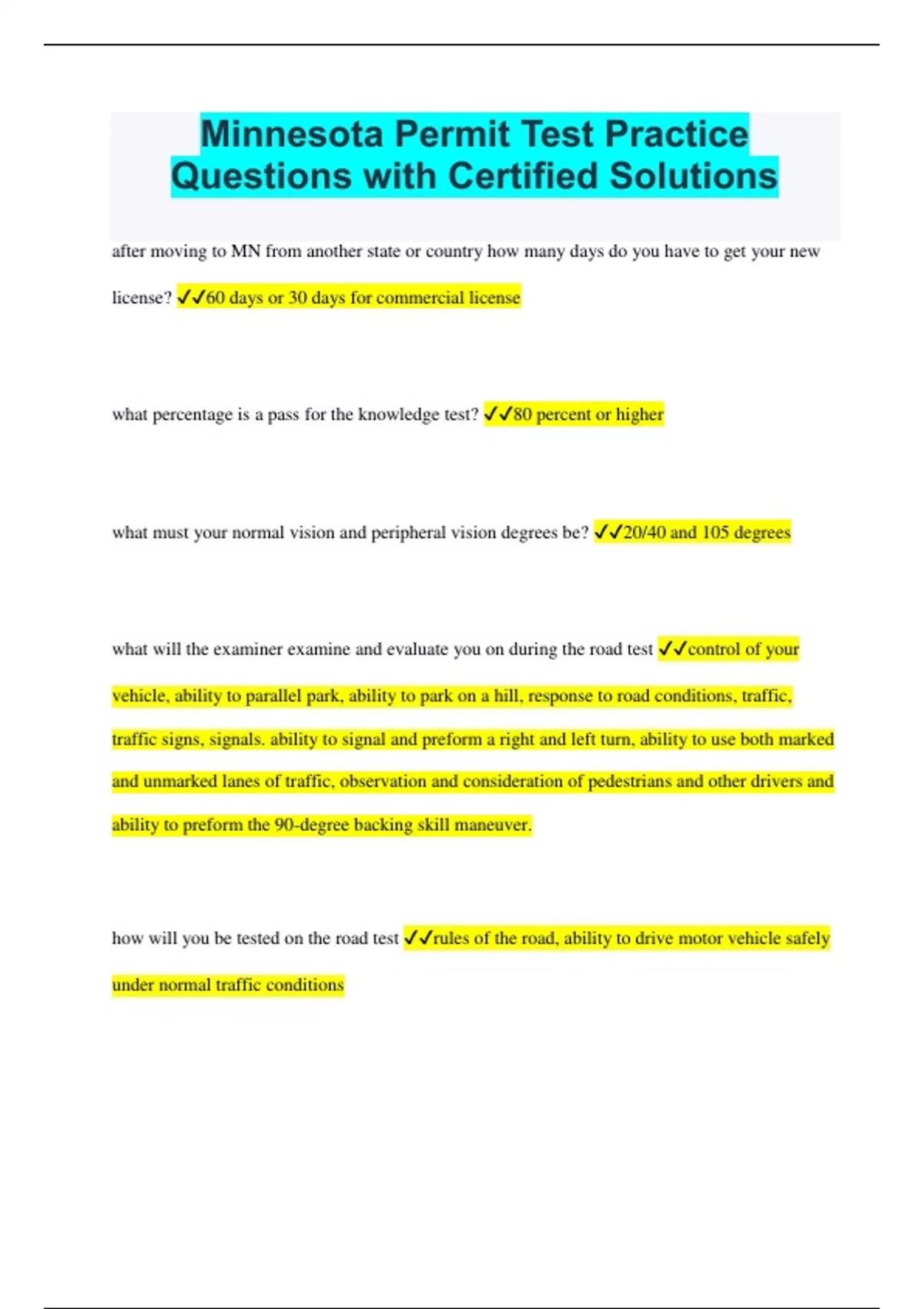 Minnesota Permit Test Practice Questions with Certified Solutions after moving to MN from another state or country how many days do you have to get your new license? 60 days or 30 days for commercial license what percentage is a pass for the knowledge test? 80 percent or higher what must your normal vision and peripheral vision degrees be? 20/40 and 105 degrees what will the examiner examine and evaluate you on during the road test control of your vehicle, ability to parallel park, ability to park on a hill, response to road conditions, traffic, traffic signs, signals. ability to signal and preform a right and left turn, ability to use both marked and unmarked lanes of traffic, observation and consideration of pedestrians and other drivers and ability to preform the 90-degree backing skill maneuver. how will you be tested on the road test rules of the road, ability to drive motor vehicle safely under normal traffic conditions how will the examiner evaluate your road test by your awareness of risks and how you react to them What must you demonstrate knowledge of before the driving portion of the road test? seat adjustment, seat belt, emergency (parking) brakes, activating the high and low beams of a car, hazard warning lights (four way flashers), horn, windshield wipers, windshield defroster and fan control and mirrors what does the 90-degree backing skill maneuver simulate backing into a ten foot wide driveway or parking space what actions will cause you to fail the road test immediately disobeying traffic laws,dangerous/careless/reckless driving that could result in traffic crash,inability to control your vehicle or complete a maneuver without assistance from the examiner, involving your vehicle in a crash that you could have avoided even if it wasn't your fault, not cooperating with examiner what must you do to obtain instructional permit be at least 15 years old, complete 30 hours of classroom,comply with id requirements, pass vision screening and knowledge test, complete license application and pay required permit fee how long is your provisional license valid for 2 years how old must you be to qualify for a provisional lisence at least 16 how old must you be to qualify for a restricted farm work drivers license, a special medical drivers license, or a moped license after completing a driver education course and passing a road test. at least 15 what is the most common license class D what does a class D licence let you drive all single unit vehicles (cars,pickups and small trucks) that weigh 26000 pounds or less what does an "S" endorsements allow you to do? drive a school bus what does an "M" endorsement allow you to do? drive a motorcycle what must you have to drive all motorcycles, school buses, double and triple trailers, tankers, and any hazardous waste material containment vehicles? endorsements on your lisense as of 2018 how much does a provisional drivers license cost? 16.25 USD how much does a class D instructional permit cost and how long is it good for? 14.25 USD. 2 years what is the speed limit in alleys? 10 mph what does the statutory speed law make the speed limit on urban or town roads? 30 mph what does the statutory speed law make the speed limit in rural or country areas? 55 mph what are the three speed laws? posted, statutory, basic what is the speed limit on two-lane highways with a posted speed limit of 55 mph or higher when the driver is lawfully passing