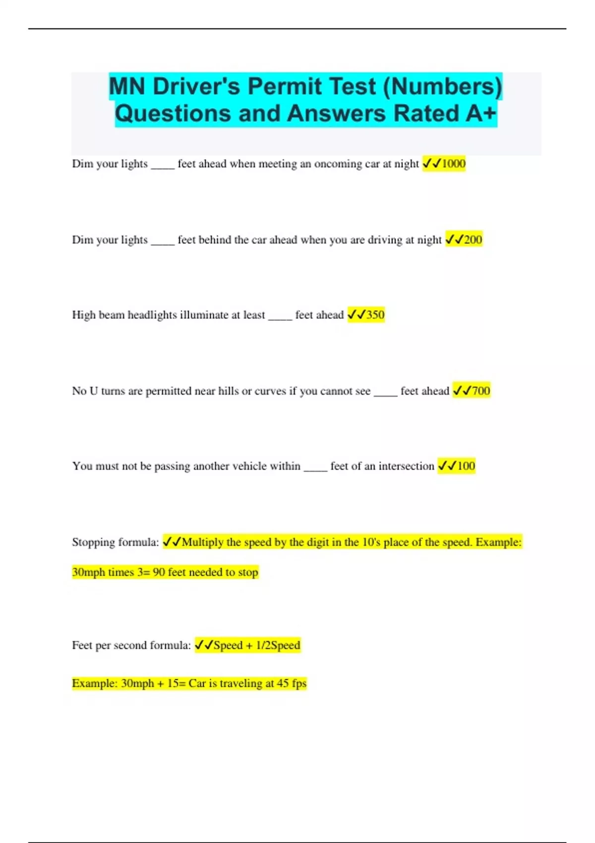 MN Driver's Permit Test (Numbers) Questions and Answers Rated A+ Dim your lights ____ feet ahead when meeting an oncoming car at night 1000 Dim your lights ____ feet behind the car ahead when you are driving at night 200 High beam headlights illuminate at least ____ feet ahead 350 No U turns are permitted near hills or curves if you cannot see ____ feet ahead 700 You must not be passing another vehicle within ____ feet of an intersection 100 Stopping formula: Multiply the speed by the digit in the 10's place of the speed. Example: 30mph times 3= 90 feet needed to stop Feet per second formula: Speed + 1/2Speed Example: 30mph + 15= Car is traveling at 45 fps Do not drive any closer than ___ feet behind a fire truck on a fire call 500 Headlights are required during daylight hours if visibility does not permit you to see ____ feet 500 You must report an accident to the Commissioner of Highways if total damage was at least $___ $1000 You must signal at least ___ feet before your turn 100 If you are towing a trailer on the highway, you must maintain a distance of ___ feet behind the vehicle ahead 500 Ice is most slippery at what temperature? 32 degrees F 0 degrees C You may park no closer than __ feet from a fire hydrant 10 Park no closer than ___ feet from the crosswalk at an uncontrolled intersection 20 Park no closer than __ feet from a stop sign, flashing beacon, or traffic control signal located on the side of the road 30 Park no closer than __ feet from a railroad track 50 When there are no speed limit signs in an urban area the speed limit is ___ mph 30 When there are no speed limit signs in the country the speed limit is ___ mph 55 When you meet a school bus with flashers flashing and arm extended, how many feet back must you stop? 20 When making a left turn, a center island becomes a roadway if it is at least __ feet wide 30 Top speed through an alley is ___ mph 10