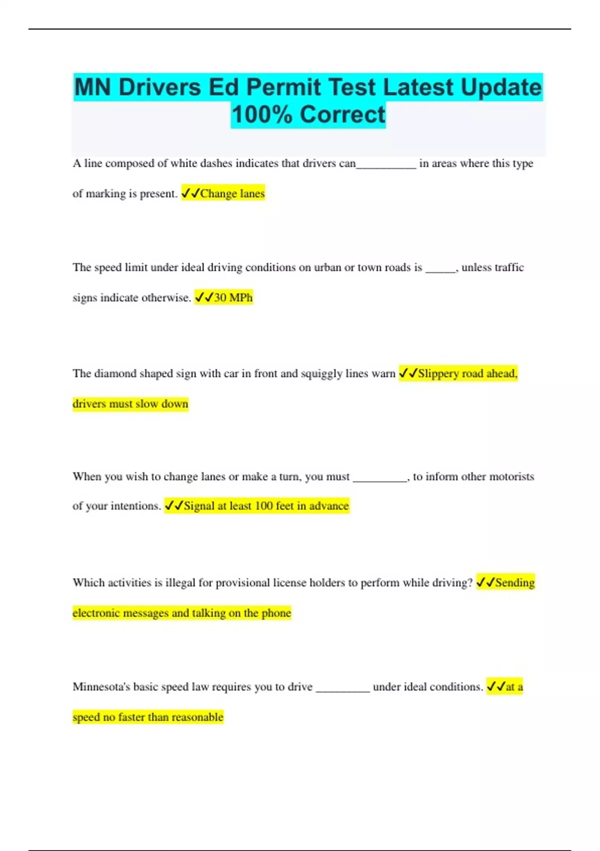 MN Drivers Ed Permit Test Latest Update 100% Correct A line composed of white dashes indicates that drivers can__________ in areas where this type of marking is present. Change lanes The speed limit under ideal driving conditions on urban or town roads is _____, unless traffic signs indicate otherwise. 30 MPh The diamond shaped sign with car in front and squiggly lines warn Slippery road ahead, drivers must slow down When you wish to change lanes or make a turn, you must _________, to inform other motorists of your intentions. Signal at least 100 feet in advance Which activities is illegal for provisional license holders to perform while driving? Sending electronic messages and talking on the phone Minnesota's basic speed law requires you to drive _________ under ideal conditions. at a speed no faster than reasonable While driving a car, you must avoid placing your hands on the steering wheel at the _________ positions. 10 o'clock and 2 o'clock In a standard passenger car, partial hydroplaning can begin at speeds as low as: 35 MPH When you see a school bus stopped with its red lights flashing and its stop arm extended, you must _________, except if it is on the opposite side of a separated roadway. stop your vehicle at least 20 feet from the bus A diamond shaped sign with a Y picture means Y-intersection ahead If you are towing a camper or trailer with your vehicle, you must maintain_________ from other vehicles. at least 500 feet following distance Anyone who flees a police officer using a motor vehicle is sentenced to imprisonment for not more than: 3 years and one day Diamond shaped sign with narrow lines means Narrow bridge ahead If a pedestrian is in a marked or unmarked crosswalk, you must: Stop and wait until pedestrian has crossed When two vehicles reach an intersection at the same time, and there is no traffic light or signal, then the driver of: The vehicle of the left must yield to the vehicle of the right When you are within 1,000 feet of an oncoming vehicle, or following another vehicle at a distance of 200 feet or less, you must: Use low beam lights A center lane between lanes of traffic traveling in opposite directions may be designated for: Left turns only You must maintain a safe distance between your vehicle and the vehicle in front of you by using: Three second rule The rectangle sign with ">" means Road turns ahead; slow to a safe speed Passing a commercial vehicle takes _________ compared to a passenger vehicle on a level highway. 3-5 seconds longer An __________ is the connection of a freeway to a road or another freeway by a series of ramps. interchange An emergency vehicle displaying flashing red lights and sounding a siren or bell approaches your vehicle when you are in an intersection. You must: proceed through the intersection and then stop on the right side of the road If you are driving at a slower speed than other traffic on a highway or freeway, stay in the lane: nearest to the right side of the road