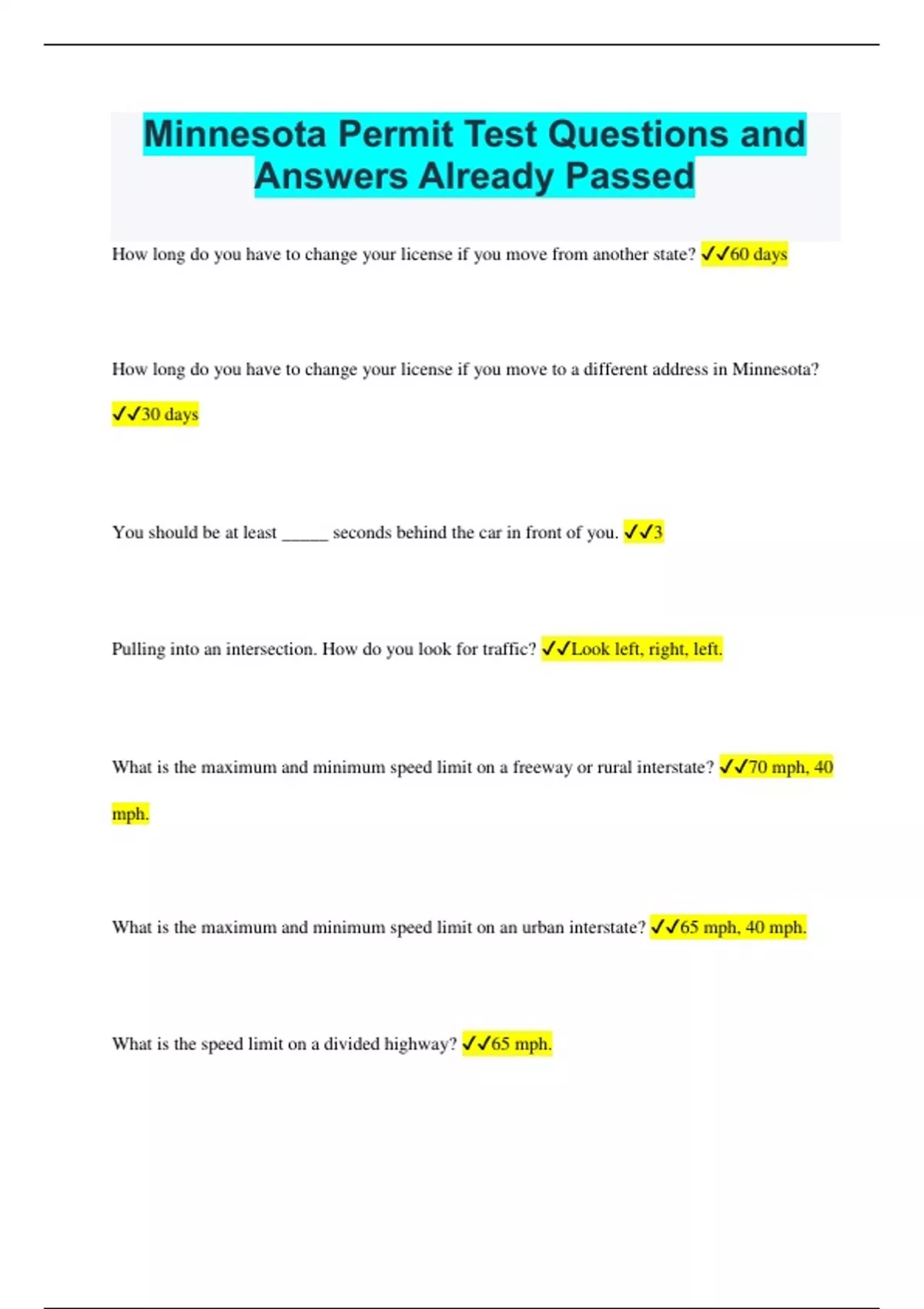 Minnesota Permit Test Questions and Answers Already Passed