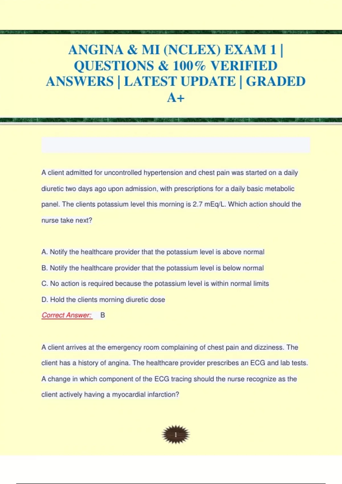 ANGINA & MI (NCLEX) EXAM 1 | QUESTIONS & 100% VERIFIED ANSWERS | LATEST UPDATE | GRADED A+ ANGINA & MI (NCLEX) EXAM 1 | QUESTIONS & 100% VERIFIED ANSWERS | LATEST UPDATE | GRADED A+