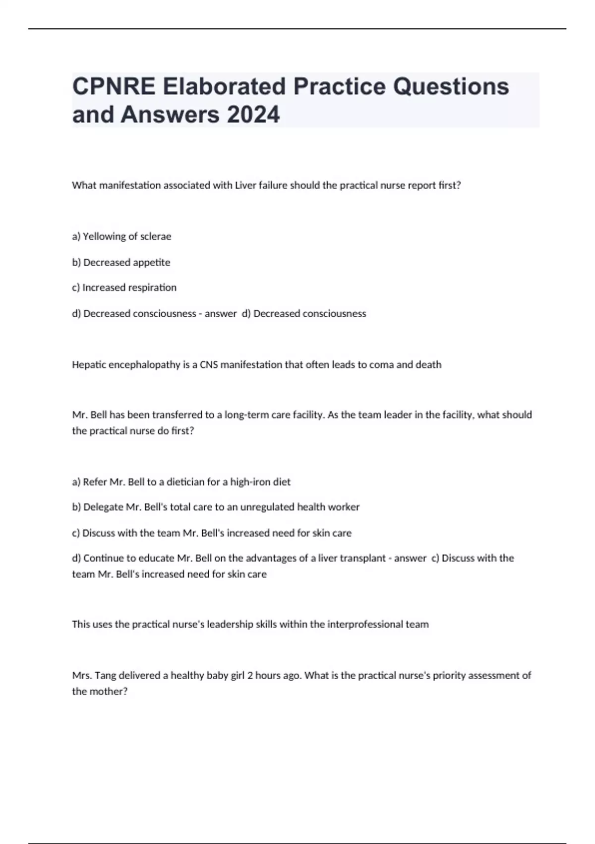 CPNRE Elaborated Practice Questions and Answers 2024 What manifestation associated with Liver failure should the practical nurse report first? a) Yellowing of sclerae b) Decreased appetite c) Increased respiration d) Decreased consciousness d) Decreased consciousness Hepatic encephalopathy is a CNS manifestation that often leads to coma and death Mr. Bell has been transferred to a long-term care facility. As the team leader in the facility, what should the practical nurse do first? a) Refer Mr. Bell to a dietician for a high-iron diet b) Delegate Mr. Bell's total care to an unregulated health worker c) Discuss with the team Mr. Bell's increased need for skin care d) Continue to educate Mr. Bell on the advantages of a liver transplant c) Discuss with the team Mr. Bell's increased need for skin care This uses the practical nurse's leadership skills within the interprofessional team Mrs. Tang delivered a healthy baby girl 2 hours ago. What is the practical nurse's priority assessment of the mother? a) Location and tone of the uterus b) Parent and infant attachment behaviours c) Vital signs, especially blood pressure d) Perineal edema and lochia a) Location and tone of the uterus