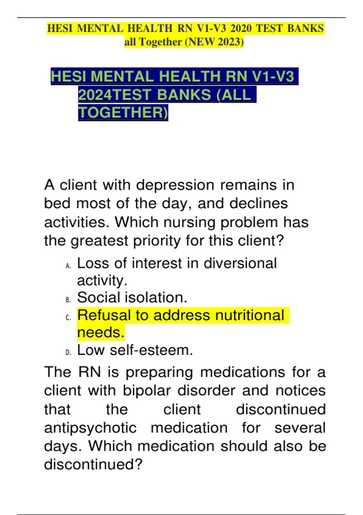 HESI MENTAL HEALTH RN V1-V3 2020 TEST BANKS all Together (NEW 2023) A client with depression remains in bed most of the day, and declines activities. Which nursing problem has the greatest priority for this client? A. Loss of interest in diversional activity. B. Social isolation. C. Refusal to address nutritional needs. D. Low self-esteem.