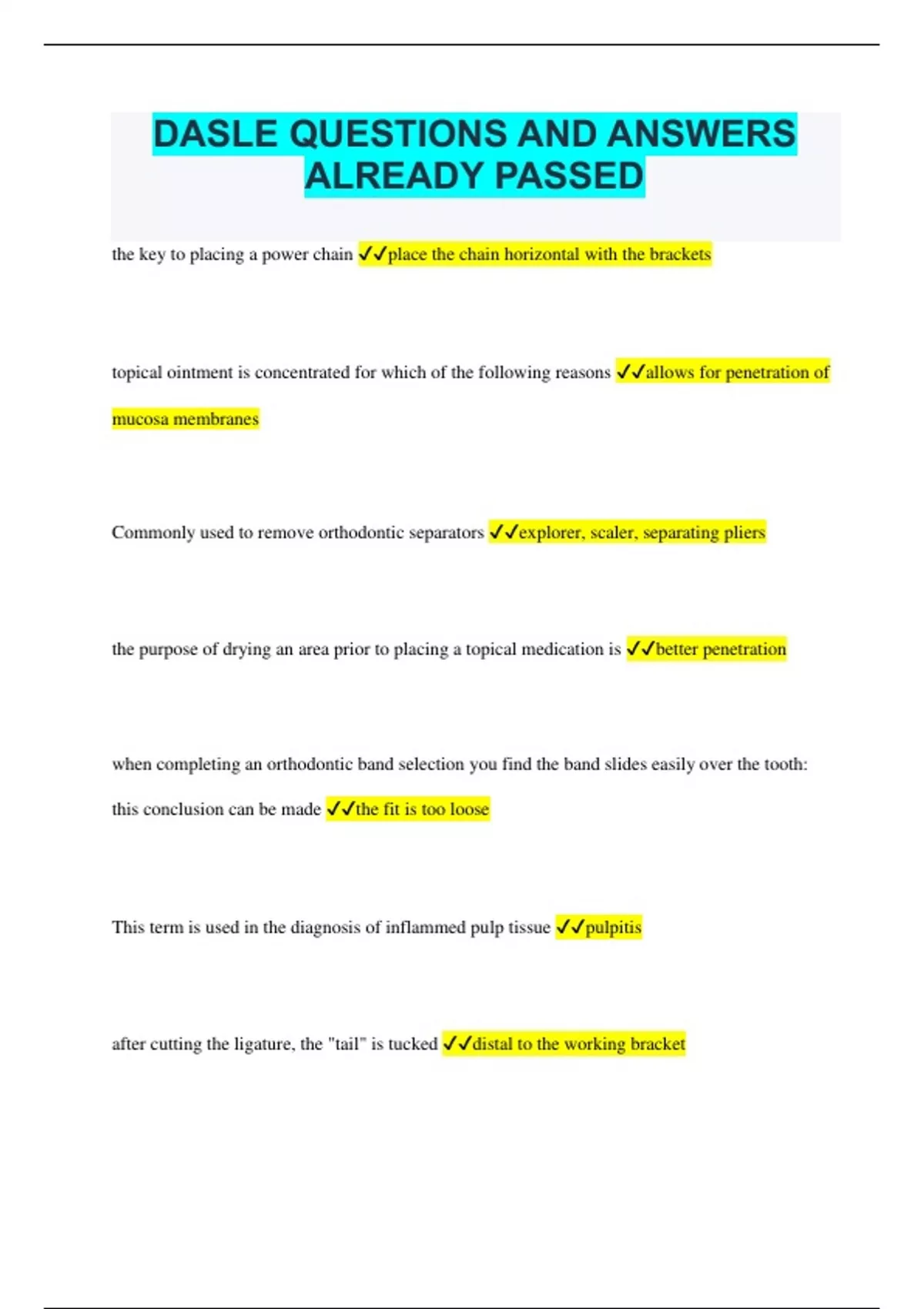 DASLE QUESTIONS AND ANSWERS ALREADY PASSED the key to placing a power chain place the chain horizontal with the brackets topical ointment is concentrated for which of the following reasons allows for penetration of mucosa membranes Commonly used to remove orthodontic separators explorer, scaler, separating pliers the purpose of drying an area prior to placing a topical medication is better penetration when completing an orthodontic band selection you find the band slides easily over the tooth: this conclusion can be made the fit is too loose This term is used in the diagnosis of inflammed pulp tissue pulpitis after cutting the ligature, the "tail" is tucked distal to the working bracket improper inversion of a dental dam may cause which of the following to occur contamination of the oral cavity when orthodontic bands are removed from fitting, they are placed onto a holding device in this manner occlusal is placed down the purpose for placing orthodontic seperators is to make room for band placement the main fillers in sealants are during inversion of the dental dam the goal is to form a cuff to block saliva from the field when removing excess cement from an orthodontic band, which instrument is done first explorer sealant adjustments, when needed, are completed using a round bur these cells cause bone to resorb ostoeclasts which of the following stains is usually associated with poor oral hygiene and are yellow to brown in color brown stain the beaks of a dental dam forceps will face this direction when placing a clamp toward the working arch bracket design allows ______ to sit horizontally the the bracket arch wire if a lubericant is used in dental dam placement, which of the following is best water based orthodontic ligature ties, when trimmed, should leave a "tail" of ______ length 3mm which of the following dental dam clamps should be used for a large molar W-14 increasing the speed of the handpiece during mechanical polishing will have this effect frictional heat will be increased the most common dental material used for pulp capping is calcium hydroxide this attatchment for orthodontic bands is defined as being- round, found on the buccal of maxillary band headgear tubes which type of arch wire is flexible and used for initial treatment nickle titanium the irrigation material most commonly used