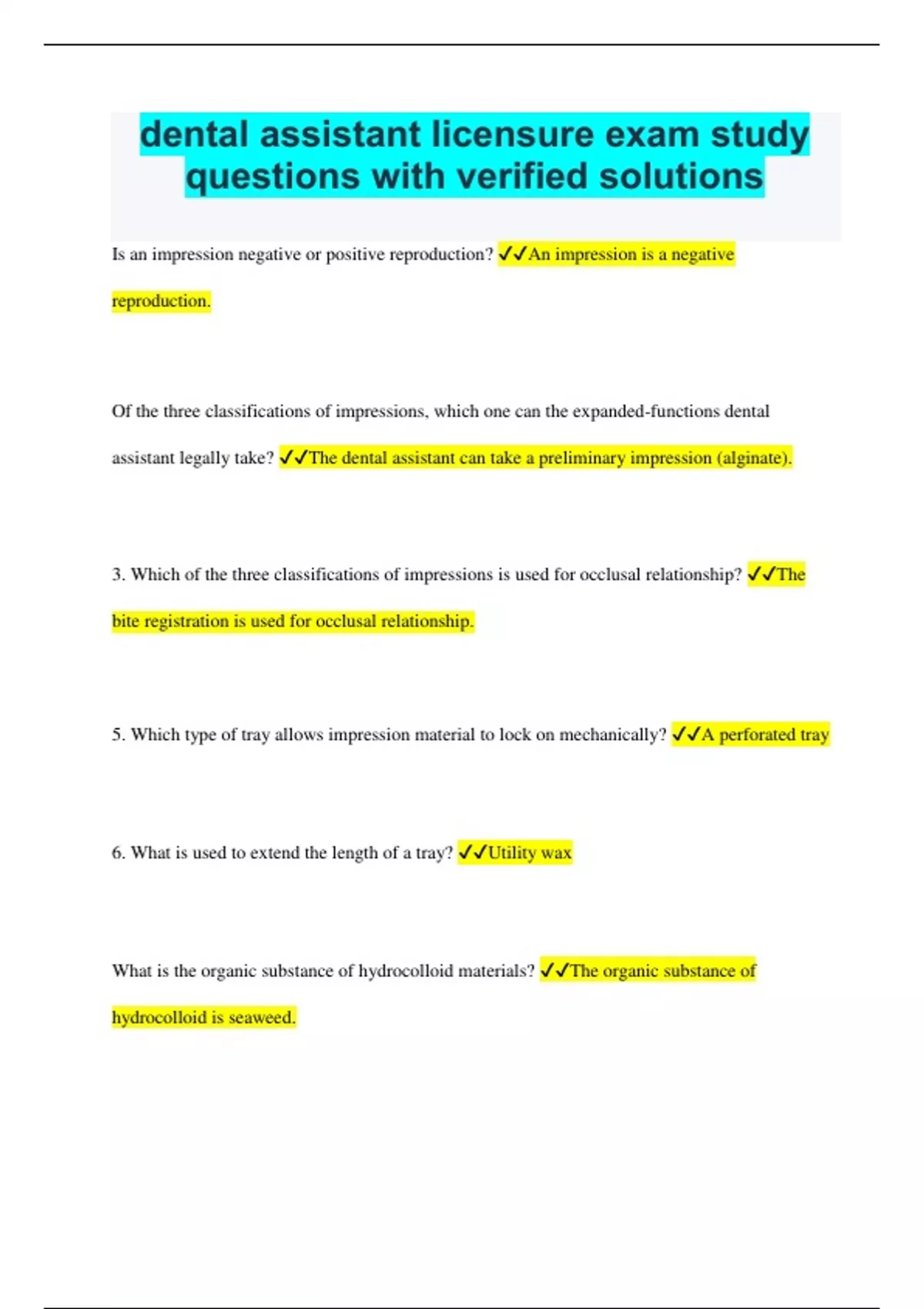 dental assistant licensure exam study questions with verified solutions Is an impression negative or positive reproduction? An impression is a negative reproduction. Of the three classifications of impressions, which one can the expanded-functions dental assistant legally take? The dental assistant can take a preliminary impression (alginate). 3. Which of the three classifications of impressions is used for occlusal relationship? The bite registration is used for occlusal relationship. 5. Which type of tray allows impression material to lock on mechanically? A perforated tray 6. What is used to extend the length of a tray? Utility wax What is the organic substance of hydrocolloid materials? The organic substance of hydrocolloid is seaweed. Why would you select a fast-set alginate over a normal-set alginate? You would select a fast-set if the patient had a strong gag reflex. if the patient had a strong gag reflex. What is the water-to-powder ratio for taking a maxillary impression? 3 measures of powder to 3 measures of water. What does the prefix hydro- mean? water What is another name for irreversible hydrocolloid? Another name of irreversible hydrocolloid is alginate. alginate. Do you mix irreversible hydrocolloid on a paper pad or in a mixing bowl? It is mixed in a mixing bowl. What material is most often used for a bite registration? Baseplate wax ( either pink sheets or yellow wax bites) is most often used for a bite registration. Baseplate wax ( either pink sheets or yellow wax bites) is most often used for a bite registration. 14. What type of tray is used when using ZOE bite registration pate? A gauze bite tray Do you cool or warm the wax before placing the tray in the patient's mouth for a bite registration? You warm the wax What is the purpose of dental sealants? prevent dental caries in the pits and fissure areas. Why are pits and fissures susceptible to caries? because bacteria cannot be removed from these areas. Should sealants be the only preventive measure used? Sealants should be used as part of a comprehensive preventive program. What are the two types of polymerization? light -cured and self-cured. Why is clear sealant material less desirable? Because it is difficult to see during placements and recalls. Is there a difference in retention rates between filled and unfilled sealants? There is no difference in retention rates between filled and unfilled sealants. What is the reason for putting fluoride in dental sealant material? In case the sealant is lost, it is thought that the fluoride will have already strengthened the base of the pit or fissure. What is the range of shelf-life of sealant materials? between 18 and 36 months. What are two patient safety precautions to keep in mind when using sealants? Keeping etchant off the soft tissue and patient eyewear What determines the effectiveness of dental sealants? Retention of the dental sealant What is the function of a periodontal surgical dressing? It protects the surgical site similar to a bandage. What are the most common materials used for periodontal dressings? zinc oxide-eugenol dressings and non-eugenol dressings. What are the reasons for not using aspirin for pain relief? Aspirin can interfere with blood- clotting mechanism