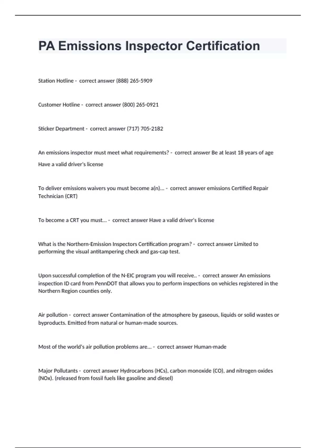 PA Emissions Inspector CertificationStation Hotline - correct answer (888) 265-5909 Customer Hotline - correct answer (800) 265-0921 Sticker Department - correct answer (717) 705-2182 An emissions inspector must meet what requirements? - correct answer Be at least 18 years of age Have a valid driver's license To deliver emissions waivers you must become a(n)... - correct answer emissions Certified Repair Technician (CRT) To become a CRT you must... - correct answer Have a valid driver's license What is the Northern-Emission Inspectors Certification program? - correct answer Limited to performing the visual antitampering check and gas-cap test. Upon successful completion of the N-EIC program you will receive.. - correct answer An emissions inspection ID card from PennDOT that allows you to perform inspections on vehicles registered in the Northern Region counties only. Air pollution - correct answer Contamination of the atmosphere by gaseous, liquids or solid wastes or byproducts. Emitted from natural or human-made sources. Most of the world's air pollution problems are... - correct answer Human-made Major Pollutants - correct answer Hydrocarbons (HCs), carbon monoxide (CO), and nitrogen oxides (NOx). (released from fossil fuels like gasoline and diesel)