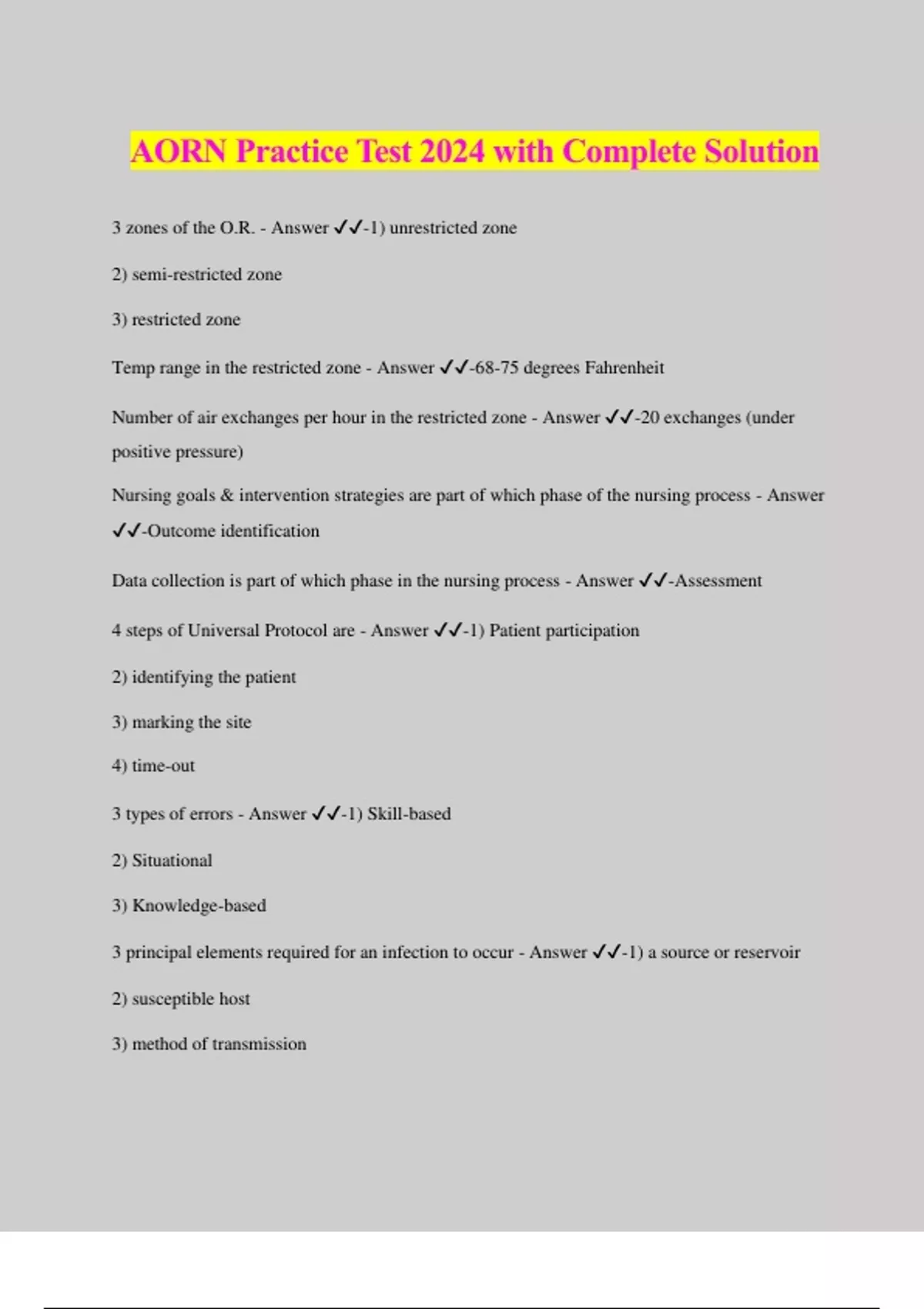 AORN Practice Test 2024 with Complete Solution 3 zones of the O.R. - Answer ️️ -1) unrestricted zone 2) semi-restricted zone 3) restricted zone Temp range in the restricted zone - Answer ️️ -68-75 degrees Fahrenheit Number of air exchanges per hour in the restricted zone - Answer ️️ -20 exchanges (under positive pressure) Nursing goals & intervention strategies are part of which phase of the nursing process - Answer ️️ -Outcome identification Data collection is part of which phase in the nursing process - Answer ️️ -Assessment 4 steps of Universal Protocol are - Answer ️️ -1) Patient participation 2) identifying the patient 3) marking the site 4) time-out 3 types of errors - Answer ️️ -1) Skill-based 2) Situational 3) Knowledge-based 3 principal elements required for an infection to occur - Answer ️️ -1) a source or reservoir 2) susceptible host 3) method of transmission Peri-op personnel precautions for the spread of airborne infections include - Answer ️️ --taking the pt from the airborne iso room to surgery & then directly back to the room - wearing PPE - using an airborne iso room - wearing a N95 or higher Foundation of SSI prevention is - Answer ️️ -Sterile technique Health care workers should be immunized with - Answer ️️ --Hep B -seasonal influenza -varicella OSHA requires health care personnel to wear what to prevent potential infectious materials from occuring - Answer ️️ --mask - eye protection - gloves immunizations & testing for health care workers don't include - Answer ️️ -shingles whose in charge of obtaining informed consent - Answer ️️ -Physicians Surgical Conscience - Answer ️️ -consider items of doubtful sterility to be contaminated Sterile - Answer ️️ -the absence of all living microorganisms Aseptic - Answer ️️ -the absence of all PATHOGENIC microorganisms When is 'closed' assisted gloving used - Answer ️️ -When gloving other team members during initial gowning & gloving Spaulding Classification System - Answer ️️ -1) Critical 2) Semicritical 3) Noncritical When should pre-op antibiotics be given - Answer ️️ -60 mins before the start of the procedure Process of Sterilization - Answer ️️ -1) Cleaning 2) Decontamination 3) Assembly 4) Packaging 5) Sterilization 6) Storage 7) Transportation What is the single most important step in making a medical device ready for reuse - Answer ️️ -CLEANING 4 parameters that affect steam sterilization - Answer ️️ -1) saturation 2) pressure 3) temp 4) time