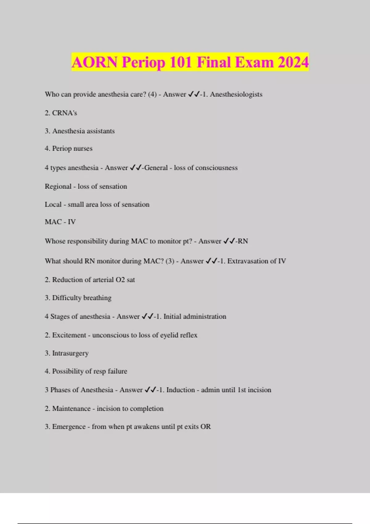 AORN Periop 101 Final Exam 2024 Who can provide anesthesia care? (4) - Answer ️️ -1. Anesthesiologists 2. CRNA's 3. Anesthesia assistants 4. Periop nurses 4 types anesthesia - Answer ️️ -General - loss of consciousness Regional - loss of sensation Local - small area loss of sensation MAC - IV Whose responsibility during MAC to monitor pt? - Answer ️️ -RN What should RN monitor during MAC? (3) - Answer ️️ -1. Extravasation of IV 2. Reduction of arterial O2 sat 3. Difficulty breathing 4 Stages of anesthesia - Answer ️️ -1. Initial administration 2. Excitement - unconscious to loss of eyelid reflex 3. Intrasurgery 4. Possibility of resp failure 3 Phases of Anesthesia - Answer ️️ -1. Induction - admin until 1st incision 2. Maintenance - incision to completion 3. Emergence - from when pt awakens until pt exits OR What is often used for upper extremity nerve blocks? - Answer ️️ -IV regional anesthetic/Bier block Where is epidural anesthetic injected? - Answer ️️ -between ligamentum flavum and dura (NOT spinal canal) What helps ensure proper needle placement during peripheral nerve block with regional anesthesia? - Answer ️️ -continuous nerve stimulation First sign of Malignant Hyperthermia - Answer ️️ -increased end-tidal CO2 What should be done for pt with MH crisis? - Answer ️️ -1. Stop surgery & stop triggering agents 2. Give dantrolene 3. Give 100% O2 4. Cool pt with iced saline Mentor or preceptor? "One who provides encouragement and acts as a guide and facilitator while modeling professional nursing behaviors" - Answer ️️ -Mentor Mentor or preceptor? "One who teaches, counsels, inspires, serves as a role model, and supports the growth and development of the novice for a fixed and limited period" - Answer ️️ -Preceptor Mentor or preceptor? Guides nurse through a wide range of professional activities - Answer ️️ -Mentor Mentor or preceptor? Guides nurse through defined clinical activities - Answer ️️ -Precept