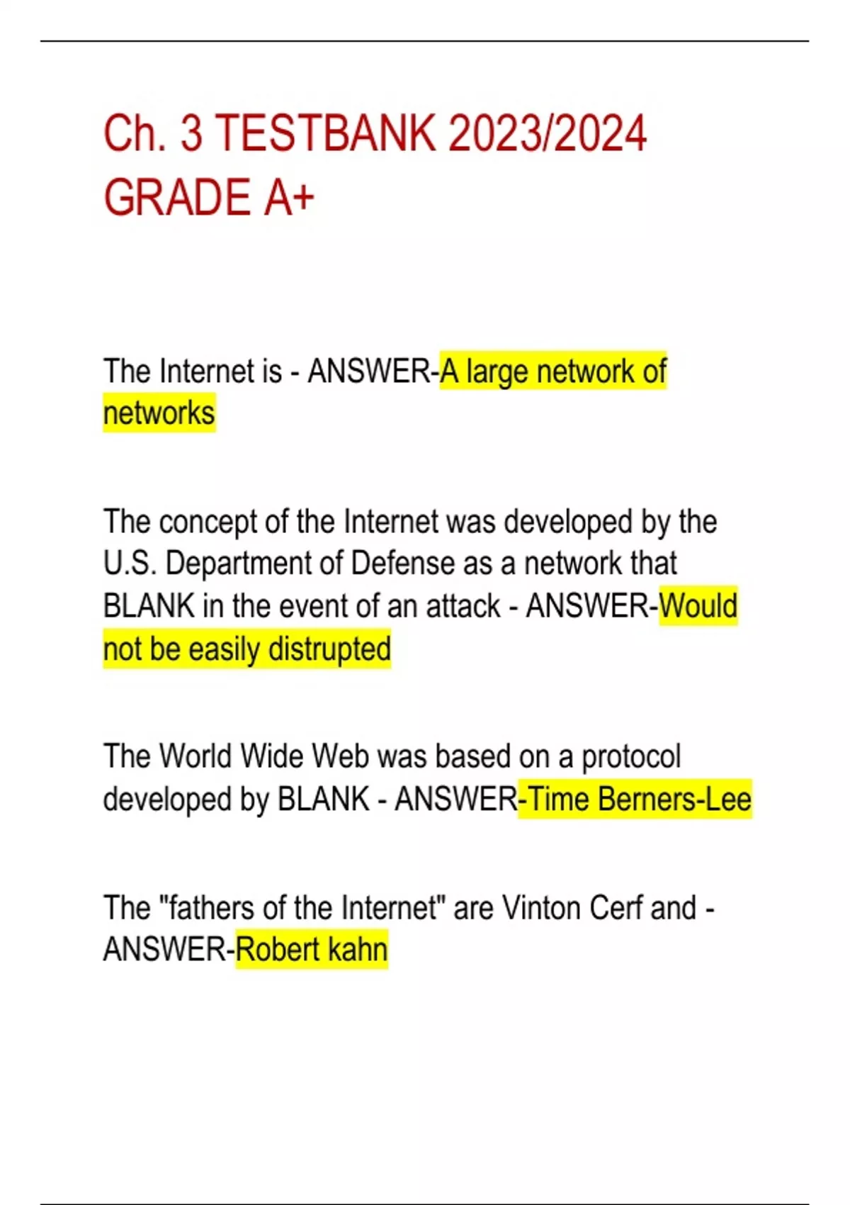 2023/2024 GRADE A+ The Internet is - ANSWER-A large network of networks The concept of the Internet was developed by the U.S. Department of Defense as a network that BLANK in the event of an attack - ANSWER-Would not be easily distrupted The World Wide Web was based on a protocol developed by BLANK - ANSWER-Time Berners-Lee The "fathers of the Internet" are Vinton Cerf and - ANSWER-Robert kahn