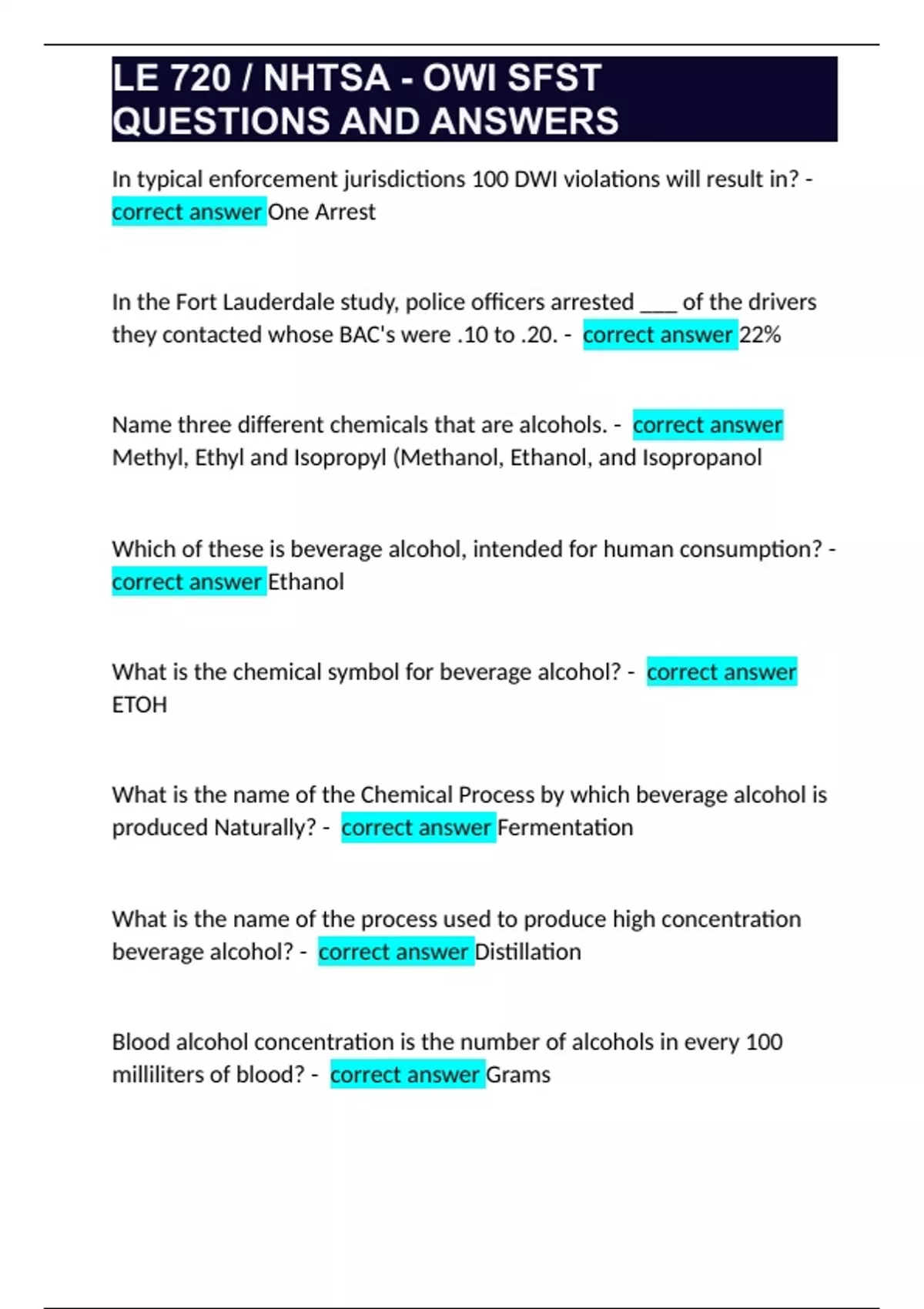 LE 720 / NHTSA - OWI SFST QUESTIONS AND ANSWERS