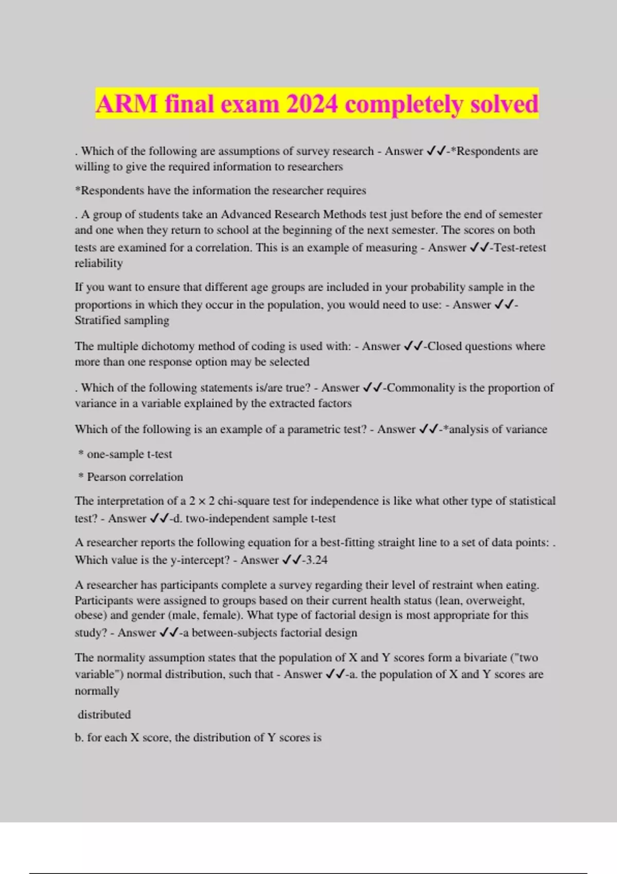 ARM final exam 2024 completely solved . Which of the following are assumptions of survey research - Answer ️️ -*Respondents are willing to give the required information to researchers *Respondents have the information the researcher requires . A group of students take an Advanced Research Methods test just before the end of semester and one when they return to school at the beginning of the next semester. The scores on both tests are examined for a correlation. This is an example of measuring - Answer ️️ -Test-retest reliability If you want to ensure that different age groups are included in your probability sample in the proportions in which they occur in the population, you would need to use: - Answer ️️ - Stratified sampling The multiple dichotomy method of coding is used with: - Answer ️️ -Closed questions where more than one response option may be selected . Which of the following statements is/are true? - Answer ️️ -Commonality is the proportion of variance in a variable explained by the extracted factors Which of the following is an example of a parametric test? - Answer ️️ -*analysis of variance * one-sample t-test * Pearson correlation The interpretation of a 2 × 2 chi-square test for independence is like what other type of statistical test? - Answer ️️ -d. two-independent sample t-test A researcher reports the following equation for a best-fitting straight line to a set of data points: . Which value is the y-intercept? - Answer ️️ -3.24 A researcher has participants complete a survey regarding their level of restraint when eating. Participants were assigned to groups based on their current health status (lean, overweight, obese) and gender (male, female). What type of factorial design is most appropriate for this study? - Answer ️️ -a between-subjects factorial design The normality assumption states that the population of X and Y scores form a bivariate ("two variable") normal distribution, such that - Answer ️️ -a. the population of X and Y scores are normally distributed b. for each X score, the distribution of Y scores is normally distributed c. for each Y score, the distribution of X scores is normally distributed What is the problem with the following data for computing a correlation? Factor 1 Facto