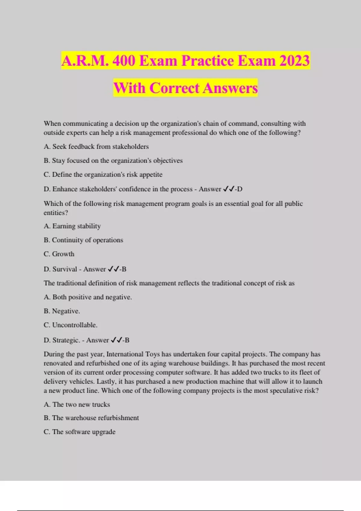 A.R.M. 400 Exam Practice Exam 2023 With Correct Answers When communicating a decision up the organization's chain of command, consulting with outside experts can help a risk management professional do which one of the following? A. Seek feedback from stakeholders B. Stay focused on the organization's objectives C. Define the organization's risk appetite D. Enhance stakeholders' confidence in the process - Answer ️️ -D Which of the following risk management program goals is an essential goal for all public entities? A. Earning stability B. Continuity of operations C. Growth D. Survival - Answer ️️ -B The traditional definition of risk management reflects the traditional concept of risk as A. Both positive and negative. B. Negative. C. Uncontrollable. D. Strategic. - Answer ️️ -B During the past year, International Toys has undertaken four capital projects. The company has renovated and refurbished one of its aging warehouse buildings. It has purchased the most recent version of its current order processing computer software. It has added two trucks to its fleet of delivery vehicles. Lastly, it has purchased a new production machine that will allow it to launch a new product line. Which one of the following company projects is the most speculative risk? A. The two new trucks B. The warehouse refurbishment C. The software upgrade D. The new production machine - Answer ️️ -D Which one of the following statements is true regarding the basic measures that apply to risk management? A. Consequences measure the degree to which an occurrence could positively or negatively affect an organization. B. Hedging is a risk management strategy that can reduce the risk of correlation. C. Risk increases as volatility decreases. D. Longer time horizons are generally less risky that shorter ones. - Answer ️️ -A Which one of the following provides a measure of the maximum potential damage associated with an occurrence? A. Exposure B. Duration C. Underwriting risk D. Maximum probable loss - Answer ️️ -A Samuel was recently hired as a risk management professional for Parker Property Management. He has been asked by senior management to review the organization's current insurance policies to make sure that the organization is adequately protected, and also see if there are any opportunities to save on the premiums. Samuel must do which one of the following through internal communication before he will be able to complete this task? A. Determine the organization's risk appetite B. Identify all of the risks that the organization faces C. Earn the confidence of the organization's board of directors D. Become familiar with industry regulations - Answer ️️ -A Catastrophes such as recent earthquakes and the 2011 tsunami in Japan pointed out a need for many organizations to evaluate and manage their A. Supply-chain risk. B. Derivative risk. C. Compliance risk. D. Political risk. - Answer ️️ -A Risk management professionals must collaborate with data analysts during which two steps of the risk management process? A. Treat risks and monitor risk treatments B. Scan the environment and analyze risks C. Analyze risks and monitor risk treatments D. Identify risks and treat risks - Answer ️️ -C Asking a question such as "How do you think this will work out?" can help a speaker do which one of the following? A. Request feedback and determine if the message has been understood B. Gain the support of executives and decision makers C. Build trust among a diverse group of individuals D. Deliver a message that recipients don't want to hear - Answer ️️ -A Carla, the risk manager, was asked by senior management to deliver a presentation on cyber risk at an all employees meeting. Even though she was only allotted 30 minutes for her presentation, Carla felt that cyber risk was a very real risk for the corporation and she wanted employees to leave with some fear of it. She wanted to provide employees with as much technical information as possible, and familiarize them with all of the important jargon. Less than 20 minutes into her presentation, Carla could tell that many of the employees were not paying any attention to her presentation. Which one of the following steps in the communication process had Carla failed to consider? A. Pay attention to your body language B. Ask for feedback C. Analyze your audience D. Set a clear communication objective - Answer ️️ -C Before speaking with a group or individual, the speaker should think about what he or she wants the other person(s) to do as a result of the conversation. Which one of the following steps in the communication process does the speaker complete by doing this? A. Deliver a message the recipient(s) want to hear B. Set aside judgement C. Set a clear communication objective D. Analyze your audience - Answer ️️ -C Which one of the following risk management objectives is critical for a manufacturer seeking new capital from investors, stockholders, and creditors? A. Anticipate and recognize emerging risks B. Social responsibility C. Reduce the deterrent effects of hazard risks D. Eliminate downside risk - Answer ️️ -C Which one of the following data capture tools has led to an explosion of risk management innovation by allowing smart products to transmit data to each other and to central hubs? A. Blockchain B. Cloud computing C. Internet of Things D. Artificial intelligence - Answer ️️ -C Jean is the Risk Manager for a Fortune 1000 company. Her CFO has tasked her to analyze vulnerabilities in the firm's supply chain. The adequacy of suppliers to meet an organization's needs would be an example of which one of the following types of risk? A. Financial risk B. Strategic risk C. Operating risk D. Operational risk - Answer ️️ -D An organization must meet the standard of care that it owes to others in order to ensure that A. Legal obligations are satisfied. B. Post-loss goals are in place. C. Operations are efficient. D. Contracts ar