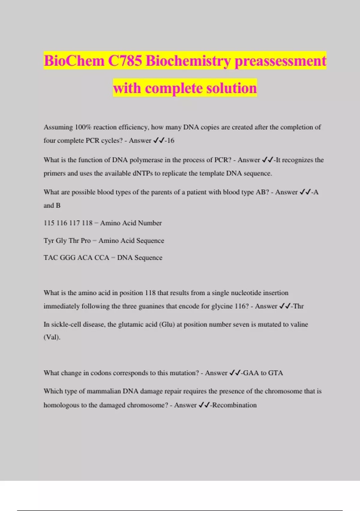 BioChem C785 Biochemistry preassessment with complete solution