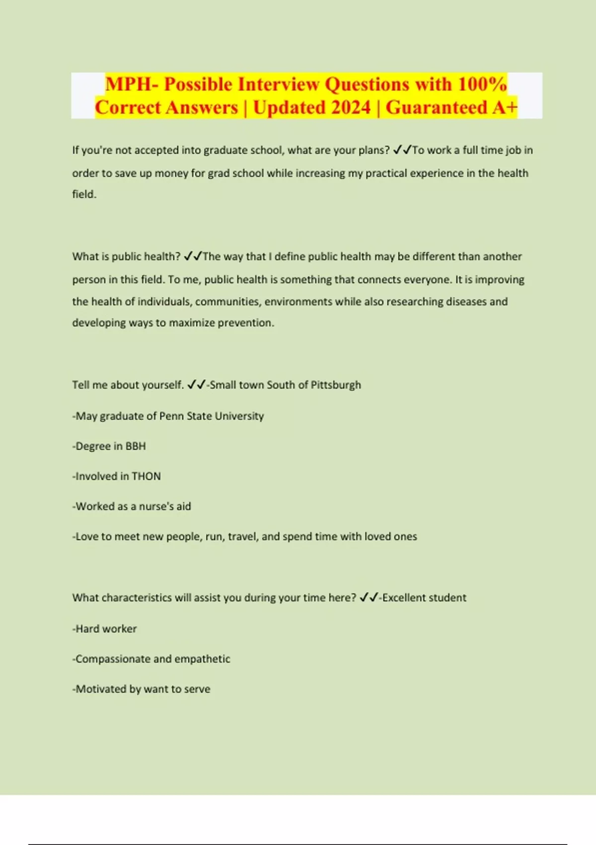 MPH- Possible Interview Questions with 100% Correct Answers | Updated 2024 | Guaranteed A+