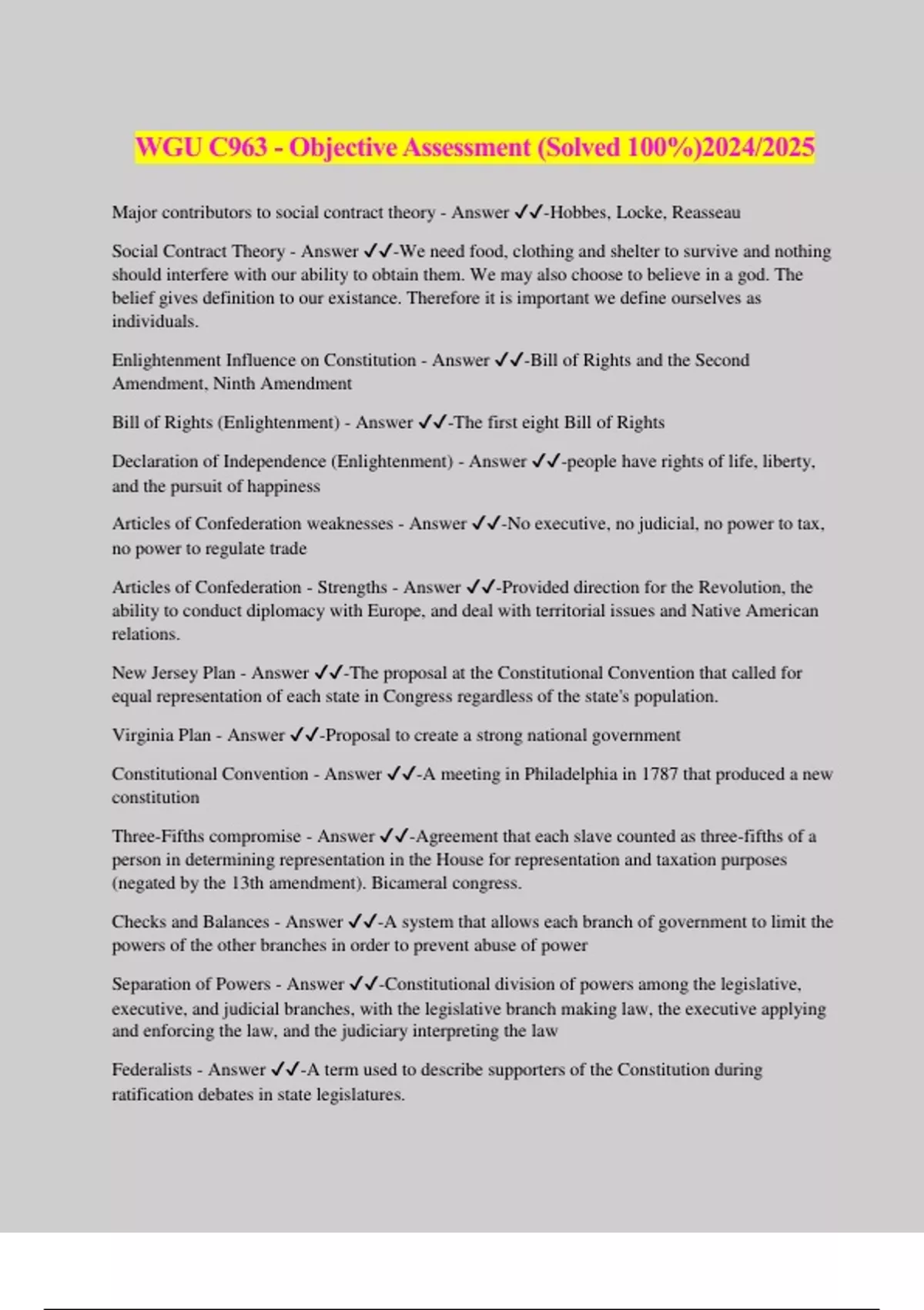 WGU C963 - Objective Assessment (Solved 100%)2024/2025 Major contributors to social contract theory - Answer ️️ -Hobbes, Locke, Reasseau Social Contract Theory - Answer ️️ -We need food, clothing and shelter to survive and nothing should interfere with our ability to obtain them. We may also choose to believe in a god. The belief gives definition to our existance. Therefore it is important we define ourselves as individuals. Enlightenment Influence on Constitution - Answer ️️ -Bill of Rights and the Second Amendment, Ninth Amendment Bill of Rights (Enlightenment) - Answer ️️ -The first eight Bill of Rights Declaration of Independence (Enlightenment) - Answer ️️ -people have rights of life, liberty, and the pursuit of happiness Articles of Confederation weaknesses - Answer ️️ -No executive, no judicial, no power to tax, no power to regulate trade Articles of Confederation - Strengths - Answer ️️ -Provided direction for the Revolution, the ability to conduct diplomacy with Europe, and deal with territorial issues and Native American relations. New Jersey Plan - Answer ️️ -The proposal at the Constitutional Convention that called for equal representation of each state in Congress regardless of the state's population. Virginia Plan - Answer ️️ -Proposal to create a strong national government Constitutional Convention - Answer ️️ -A meeting in Philadelphia in 1787 that produced a new constitution Three-Fifths compromise - Answer ️️ -Agreement that each slave counted as three-fifths of a person in determining representation in the House for representation and taxation purposes (negated by the 13th amendment). Bicameral congress. Checks and Balances - Answer ️️ -A system that allows each branch of government to limit the powers of the other branches in order to prevent abuse of power Separation of Powers - Answer ️️ -Constitutional division of powers among the legislative, executive, and judicial branches, with the legislative branch making law, the executive applying and enforcing the law, and the judiciary interpreting the law Federalists - Answer ️️ -A term used to describe supporters of the Constitution during ratification debates in state legislatures. Anti-Federalists - Answer ️️ -Opponents of the American Constitution at the time when the states were contemplating its adoption. Ratifying the Constitution - Answer ️️ -Article VII, 9 out of 13 states had to agree, it was ratified at state conventions Federalist #10 (factions) - Answer ️️ -Elites can never take over rule of the government due to too many factions. Federalist #51 (Madison) - Answer ️️ -Separation of powers, checks and balances Separations of Powers - Answer ️️ -The division of the federal government into three branches each with its own powers Government Branches - Answer ️️ -Three sections of the US government: legislative, executive, and judicial. Each branch has powers that restrict the other branches powers. How are laws made and enforced using the separation of powers - Answer ️️ -Congress originates laws Judicial branch reviews laws for constitutionality Executive branch enforces laws system of checks and balances - Answer ️️ -Constitutional system in which each branch of government places limits on the power of other branches Several checks the judicial branch has on the legislative and executive branches - Answer ️️ - Executive: Can overturn actions of the president with judicial review if the actions violate the Constitution Serve during good behavior to maintain independence of judiciary Legislative: Can overturn acts of Congress as unconstitutional if they violate the law Can influence laws by interpret