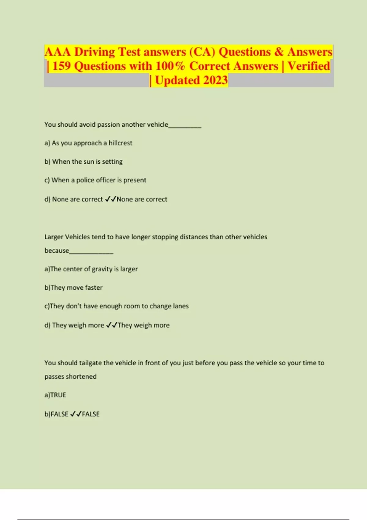 AAA Driving Test answers (CA) Questions & Answers | 159 Questions with 100% Correct Answers | Verified | Updated 2023