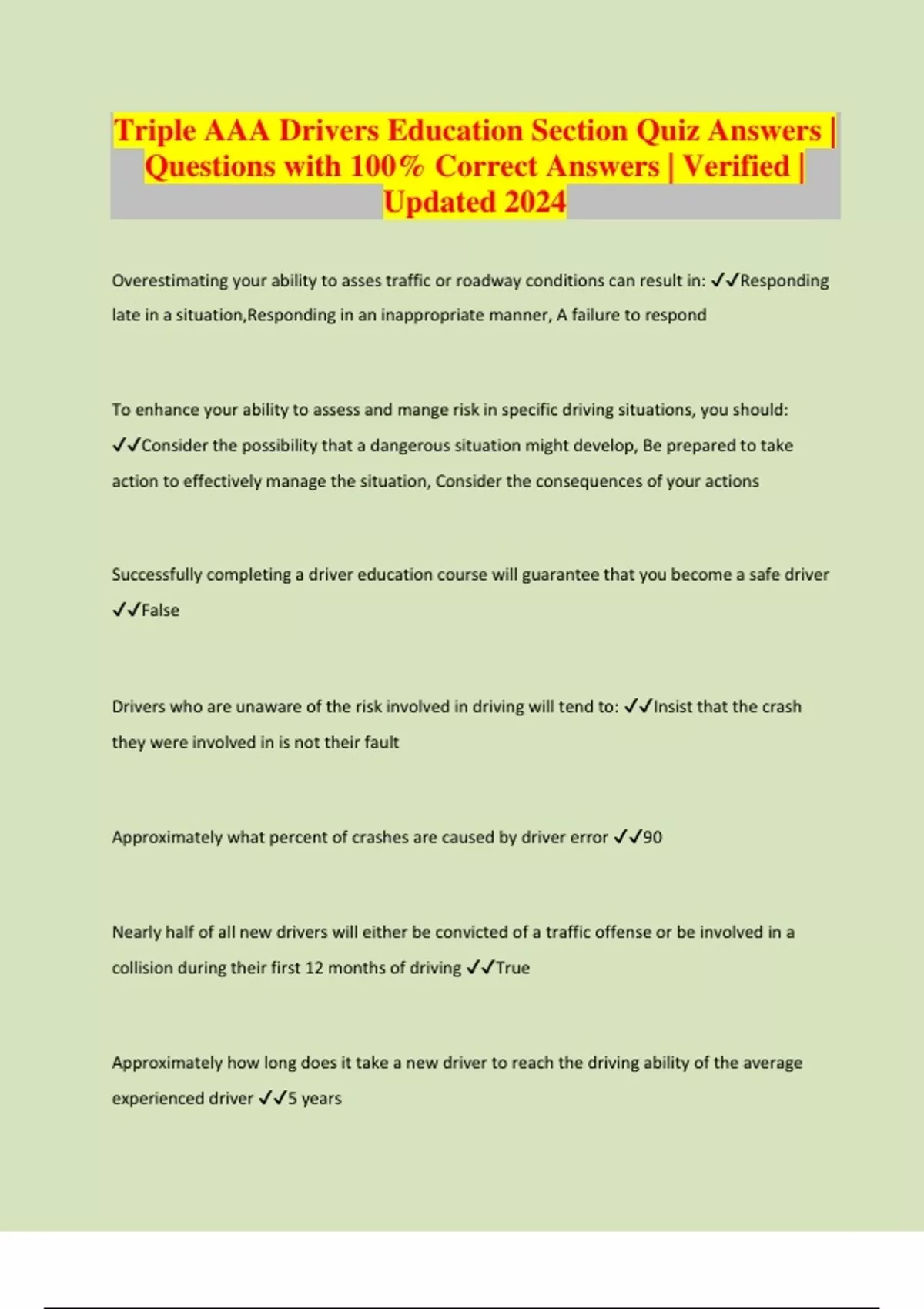 Triple AAA Drivers Education Section Quiz Answers | Questions with 100% Correct Answers | Verified | Updated 2024