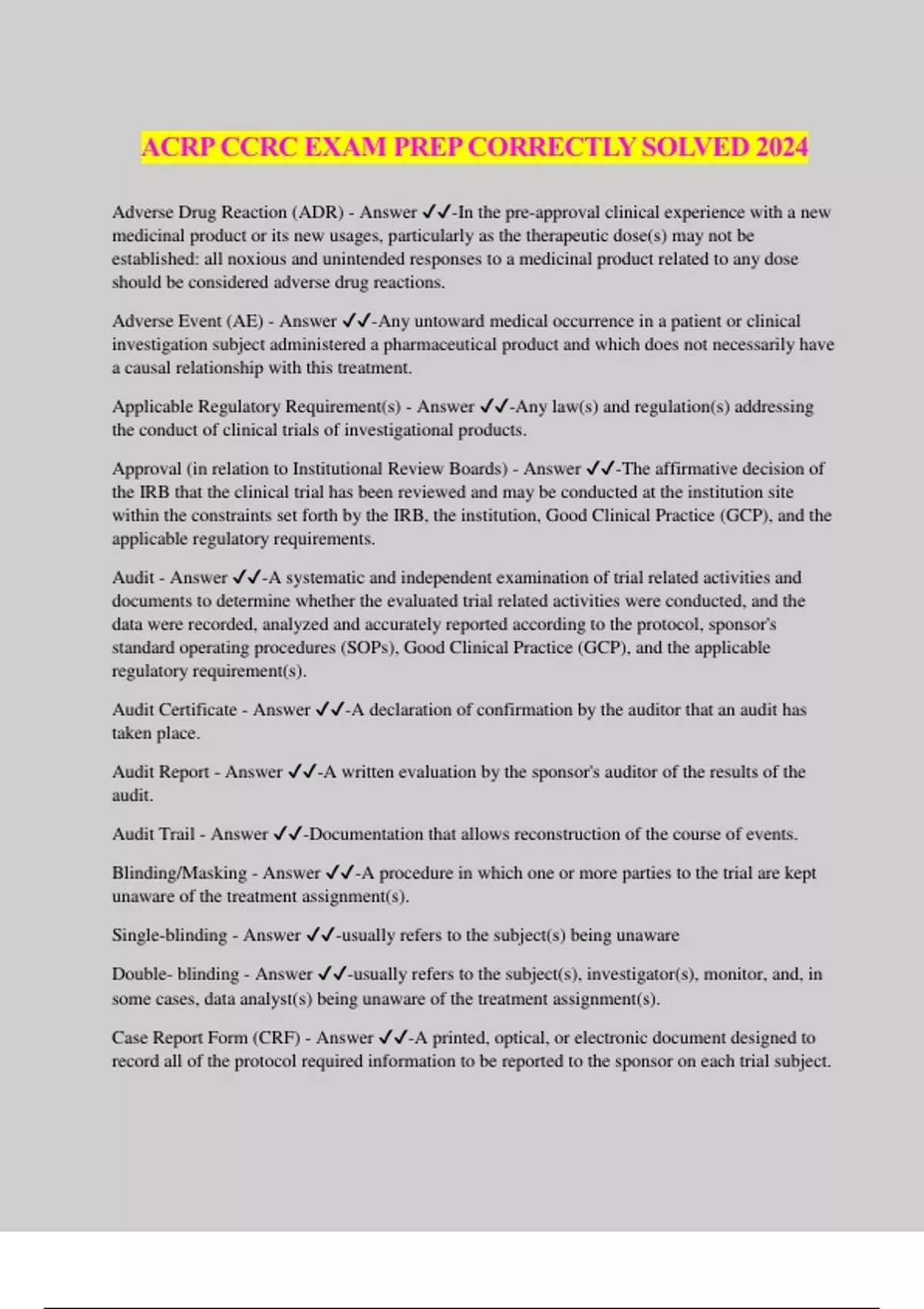 ACRP CCRC EXAM PREP CORRECTLY SOLVED 2024 Adverse Drug Reaction (ADR) - Answer ️️ -In the pre-approval clinical experience with a new medicinal product or its new usages, particularly as the therapeutic dose(s) may not be established: all noxious and unintended responses to a medicinal product related to any dose should be considered adverse drug reactions. Adverse Event (AE) - Answer ️️ -Any untoward medical occurrence in a patient or clinical investigation subject administered a pharmaceutical product and which does not necessarily have a causal relationship with this treatment. Applicable Regulatory Requirement(s) - Answer ️️ -Any law(s) and regulation(s) addressing the conduct of clinical trials of investigational products. Approval (in relation to Institutional Review Boards) - Answer ️️ -The affirmative decision of the IRB that the clinical trial has been reviewed and may be conducted at the institution site within the constraints set forth by the IRB, the institution, Good Clinical Practice (GCP), and the applicable regulatory requirements. Audit - Answer ️️ -A systematic and independent examination of trial related activities and documents to determine whether the evaluated trial related activities were conducted, and the data were recorded, analyzed and accurately reported according to the protocol, sponsor's standard operating procedures (SOPs), Good Clinical Practice (GCP), and the applicable regulatory requirement(s). Audit Certificate - Answer ️️ -A declaration of confirmation by the auditor that an audit has taken place. Audit Report - Answer ️️ -A written evaluation by the sponsor's auditor of the results of the audit. Audit Trail - Answer ️️ -Documentation that allows reconstruction of the course of events. Blinding/Masking - Answer ️️ -A procedure in which one or more parties to the trial are kept unaware of the treatment assignment(s). Single-blinding - Answer ️️ -usually refers to the subject(s) being unaware Double- blinding - Answer ️️ -usually refers to the subject(s), investigator(s), monitor, and, in some cases, data analyst(s) being unaware of the treatment assignment(s). Case Report Form (CRF) - Answer ️️ -A printed, optical, or electronic document designed to record all of the protocol required information to be reported to the sponsor on each trial subject. Clinical Trial/Study - Answer ️️ -Any investigation in human subjects intended to discover or verify the clinical, pharmacological and/or other pharmacodynamic effects of an investigational product(s), and/or to identify any adverse reactions to an investigational product(s), and/or to study absorption, distribution, metabolism, and excretion of an investigational product(s) with the object of ascertaining its safety and/or efficacy. Clinical Trial/Study Report - Answer ️️ -A written description of a trial/study of any therapeutic, prophylactic, or diagnostic agent conducted in human subjects, in which the clinical and statistical description, presentations, and analyses are fully integrated into a single report Comparator (Product) - Answer ️️ -An investigational or marketed product (i.e., active control), or placebo, used as a reference in a clinical trial. Compliance (in relation to trials) - Answer ️️ -Adherence to all the trial-related requirements, Good Clinical Practice (GCP) requirements, and the applicable regulatory requirements. Confidentiality - Answer ️️ -Prevention of disclosure, to other than authorized individuals, of a sponsor's proprietary information or of a subject's identity. Contract - Answer ️️ -A written, dated, and signed agreement between two or more involved parties that sets out any arrangements on delegation and distribution of tasks and obligations and, if appropriate, on financial matters. Coordinating Committee - Answer ️️ -A committee that a sponsor may organize to coordinate the conduct of a multicentre trial. Coordinating Investigator - Answer ️️ -An investigator assigned the responsibility for the coordination of investigators at different centres participating in a multicentre trial. Contract Research Organization (CRO) - Answer ️️ -A person or an organization (commercial, academic, or other) contracted by the sponsor to perform one or more of a sponsor's trial-related duties and functions. Direct Access - Answer ️️ -Permission to examine, analyze, verify, and reproduce any records and reports that are important to evaluation of a clinical trial. Documentation - Answer ️️ -All records, in any form (including, but not limited to, written, electronic, magnetic, and optical records, and scans, x-rays, and electrocardiograms) that describe or record the methods, conduct, and/or results of a trial, the factors affecting a trial, and the actions taken. Essential Documents - Answer ️️ -Documents which individually and collectively permit evaluation of the conduct of a study and the quality of the data produced Good Clinical Practice (GCP) - Answer ️️ -A standard for the design, conduct, performance, monitoring, auditing, recording, analyses, and reporting of clinical trials that provides ass